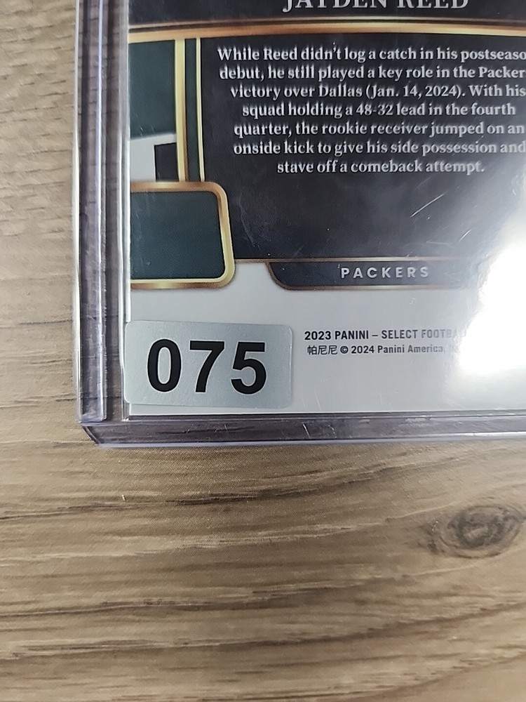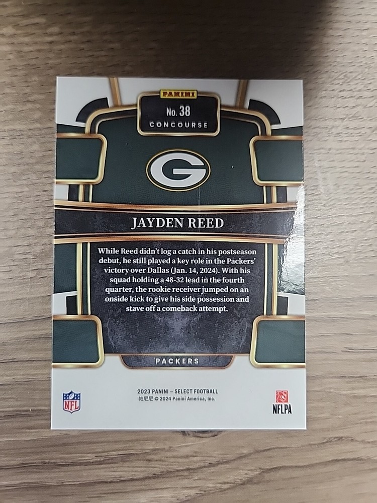 Parallel/Variety: [Base] Team: Green Bay Packers League: National Football League (NFL) Manufacturer: Panini Sport: Football Season: 2023 Features: Rookie, Base Set Card Number: 38 Player/Athlete: Jayden Reed Type: Sports Trading Card Set: 2023 Panini Select