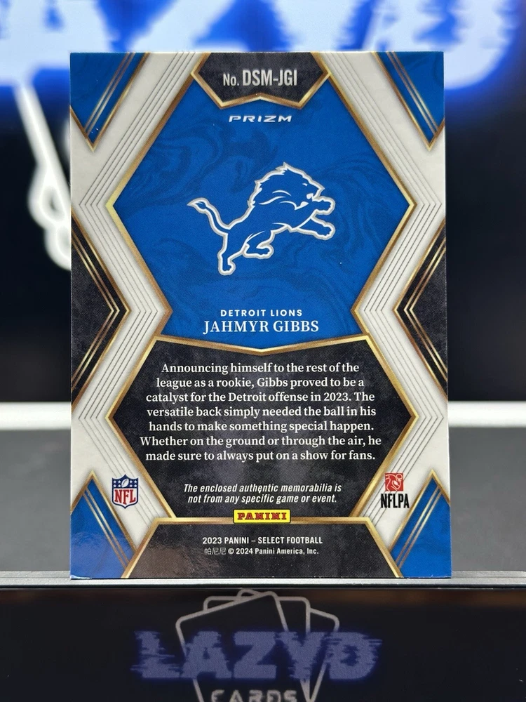 Card Number: DSM-JGI Autographed: No Print Run: N/A Parallel/Variety: Red Prizm Insert Set: Draft Selections Memorabilia Season: 2023 League: National Football League (NFL) Set: 2023 Panini Select Features: Parallel/Variety, Rookie, Insert, Memorabilia Player/Athlete: Jahmyr Gibbs Year Manufactured: 2023 Type: Sports Trading Card Team: Detroit Lions Sport: Football Manufacturer: Panini