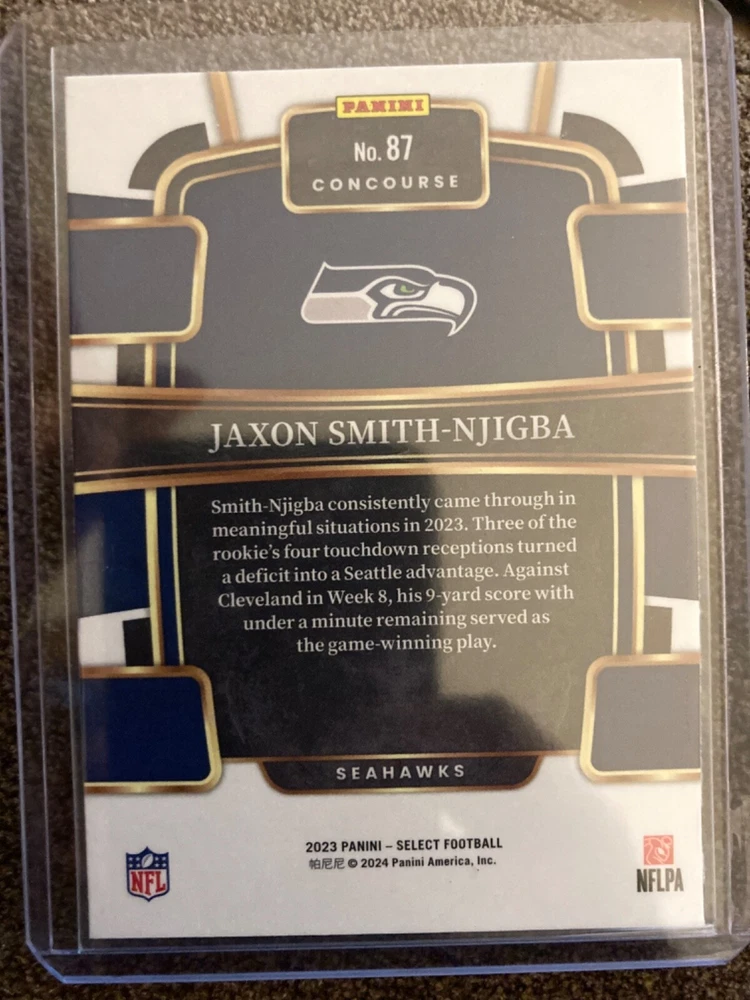 This is a 2023 Panini Select Jaxson Smith Njigba Concourse Silver (RC) #87 trading card. It features the rookie card of Jaxon Smith-Njigba, a player for the Seattle Seahawks in the National Football League (NFL). The card is part of the 2023 Panini Select set and is a Silver parallel/variety. It is a standard size sports trading card manufactured by Panini in the year 2023. The card is not autographed and its features include being a rookie card and part of the Concourse Silver series.