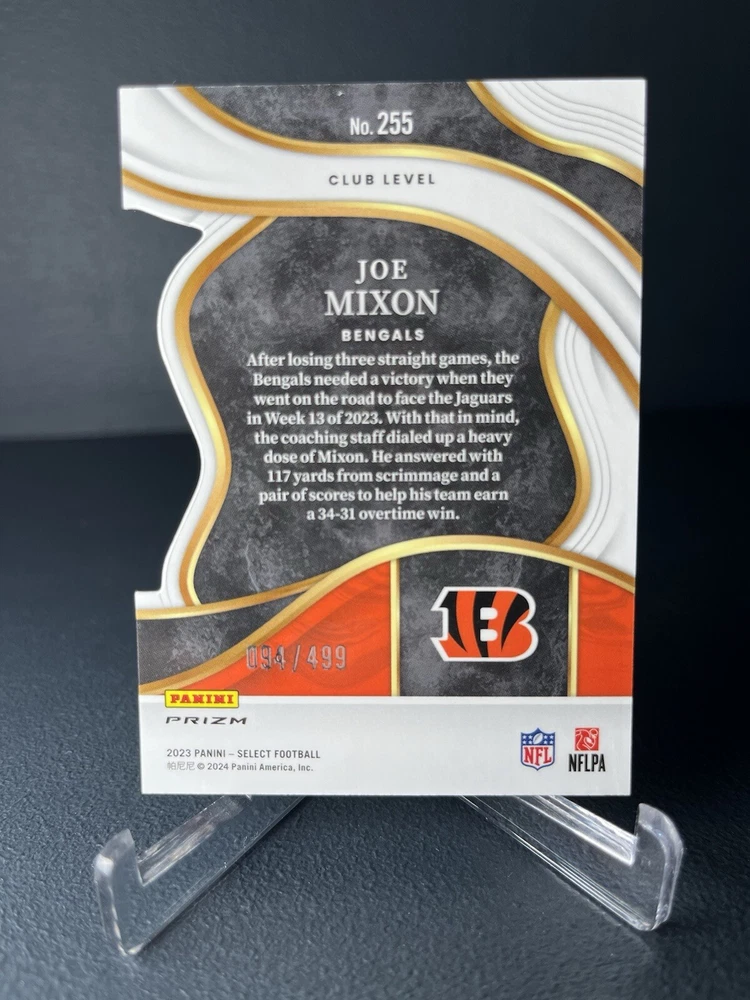 This 2023 Panini Select sports trading card features Joe Mixon of the Cincinnati Bengals and Houston Texans. The card is part of the Die-Cut parallel/variety and is serial numbered out of 499. It is a Near Mint or better conditioned card and comes from the 2023 Panini Select set. The card is authenticated by Donruss and features an authentic signature by Joe Mixon. It is a great addition to any National Football League (NFL) fan's collection. Please refer to the provided images and feel free to contact us with any questions.
