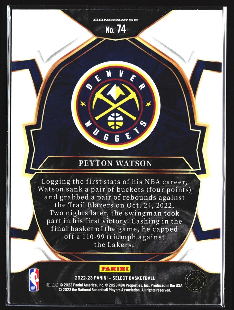 You will receive a Near Mint or Better, Peyton Watson, 2023 Panini Select, , Denver Nuggets card PLEASE NOTE: SOME CARDS THAT GO THROUGH OUR SCANNER MAY APPEAR TO HAVE LINES THROUGH THEM. THEY ARE NOT ACTUAL SCRATCHES, SIMPLY FALSE IMAGE LINES. WE WILL NOT INTENTIALLY SELL, DAMAGED CARDS. NEW CARDS LISTED DAILY ORDERS SHIP NEXT DA Y (Weekends as mail service is available) VISIT OUR STORE FOR MORE DEALS! USE THE SEARCH ICON IN THE STORE TO FIND YOUR FAVORITE TEAMS & PLAYERS! Be sure to save us as sellers to be the first to be notified when new and exciting cards are posted! Please note, we are not professional graders, and the condition of the card you purchased is highly subjective. Please refer to the high quality scans of the card you are viewing, and determine the condition of the card for yourself. Feel free to reach out with questions! All cards are in EX-NM+ condition, unless stated otherwise Chrome cards from various brands might have minor light surface scratches, which is typical with these type of cards. Any major, deep scratches or major surface issues will be noted, if present. We take pride in the condition of all of our cards, including commons. Our promise to you, is that we will not sell a card we would not buy ourselves. Of course things slip by, however customer service is our #1 Priority, and we are always here for a message for ANY, and ALL issues. Thank you very much for stopping by, feel free to reach out! - Titan (Son) & Andy (Dad)