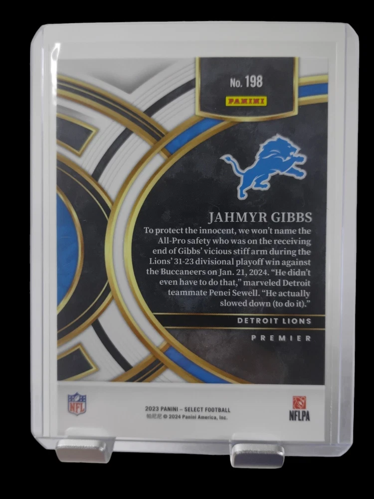This 2023 Panini Select Premier Level sports trading card features Jahmyr Gibbs of the Detroit Lions. The card number is 198 and it is a base set rookie card. The card is in excellent shape, near mint or better, and has been well-preserved. It is a great addition to any collection for fans of the National Football League (NFL) and football in general. The card is ungraded and has not been autographed. The set is part of the Panini Select series and was manufactured in 2023. Additional description is available in the Premier Level - Jahmyr Gibbs category.