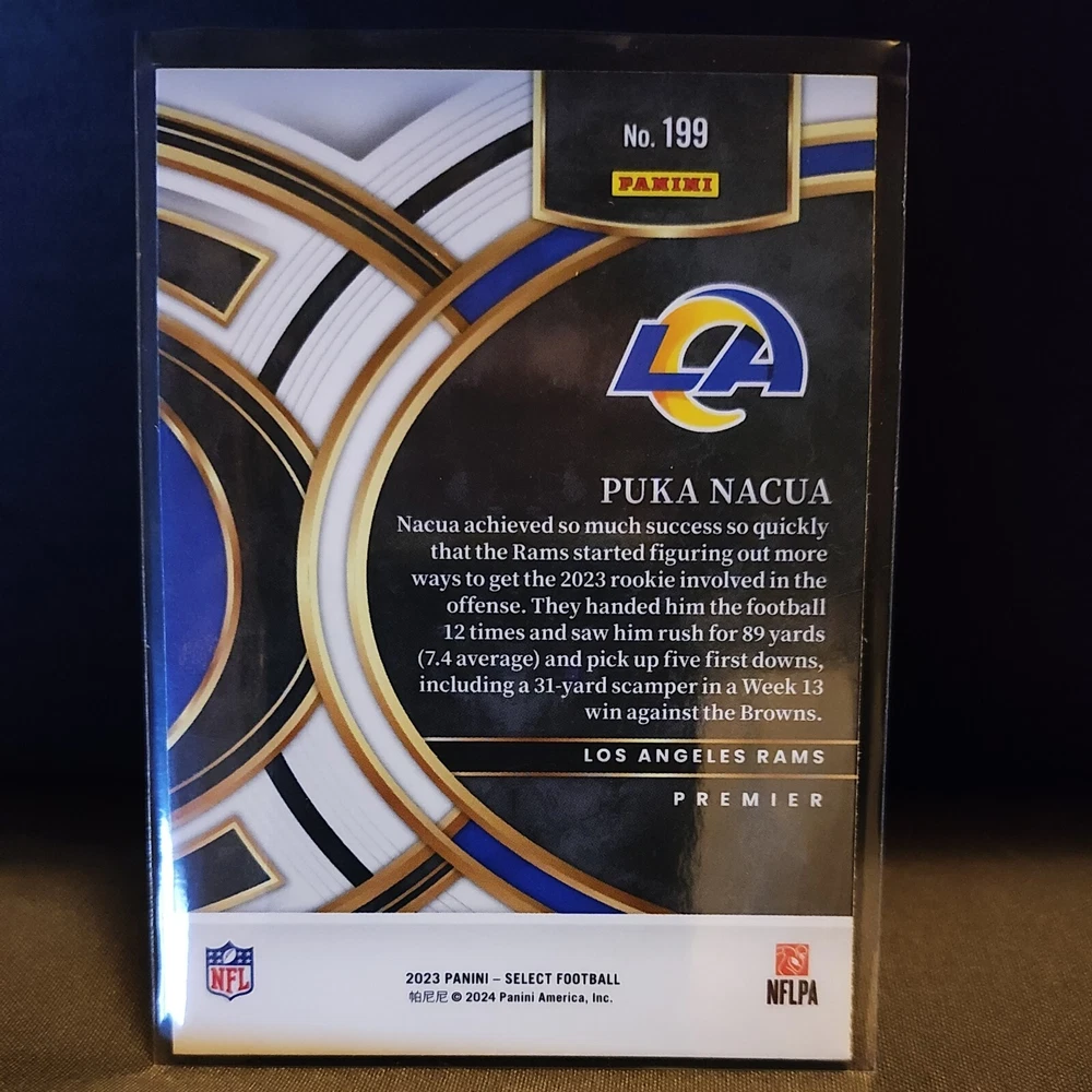 Features: Base Set, Rookie Set: 2023 Panini Select Card Number: 199 League: National Football League (NFL) Team: Los Angeles Rams Season: 2023 Sport: Football Player/Athlete: Puka Nacua Autographed: No Year Manufactured: 2023 Type: Sports Trading Card Manufacturer: Panini