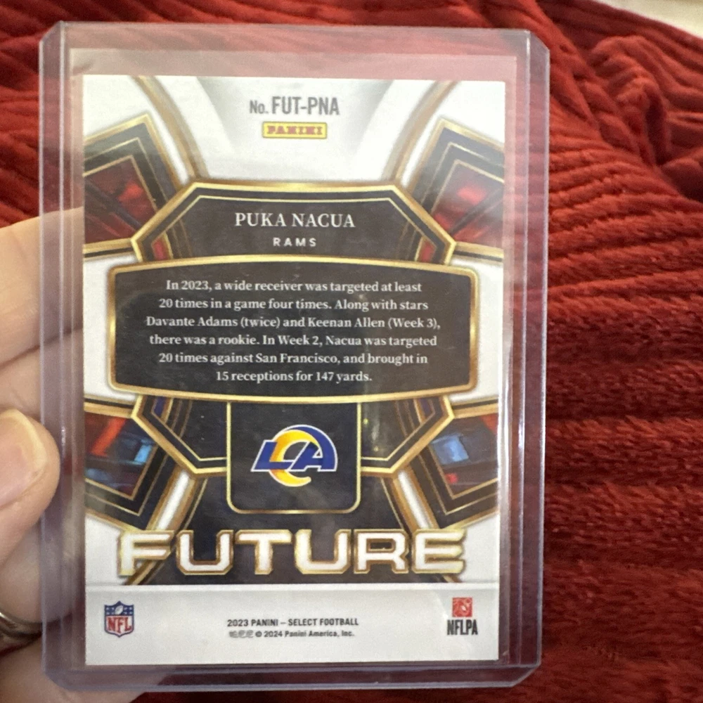 This 2023 Panini Select trading card features Puka Nacua, a rookie player from the National Football League (NFL). The card is part of the Select Future set and has the card number FUT-PNA. It is perfect for collectors who are fans of football and want to add a rare card to their collection. The card is manufactured by Panini and is a sports trading card. The card is perfect for those who want to complete their collection or those who are looking for a unique card to add to their collection. It is a great opportunity to own a rare card of a talented player. The 2023 Panini Select - Select Future #FUT-PNA Puka Nacua (RC) is a must-have for any football fan.