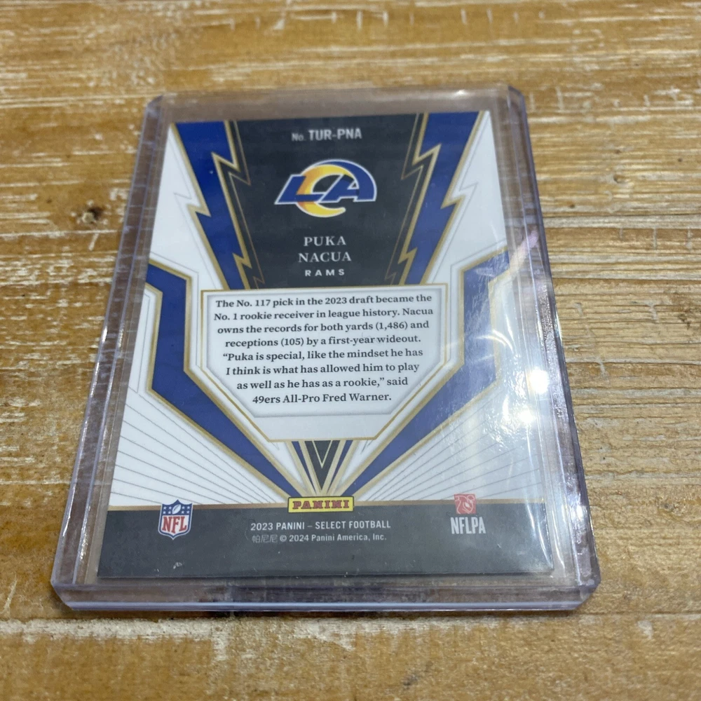 This 2023 Panini Select Turbocharged #TUR-PNA trading card features Puka Nacua, a rising star in the world of sports. The card is a great addition to any collection, especially for fans of trading card singles and sports memorabilia. With its high-quality design and attention to detail, this card is sure to impress. It's perfect for those who want to add to their collection or simply admire the art of sports trading cards. Don't miss out on the chance to own this amazing card!