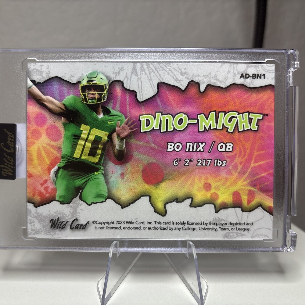For the football fanatics out there, we have a rare find for you! The 2023 Wild Card Bo NIX Dino Might 4/5 Purple sports trading card is up for grabs. This card features a serial number, making it a unique addition to your collection. It also boasts a rookie design, making it a valuable piece for collectors who are looking to add to their portfolio. The card is ungraded, but make no mistake about it, it is in excellent shape. With its stunning purple parallel/variety, it is sure to catch the eye of any collector. The 2023 Wild Card set is highly sought after, and this card is a gem that you don't want to miss out on. Add it to your collection today!