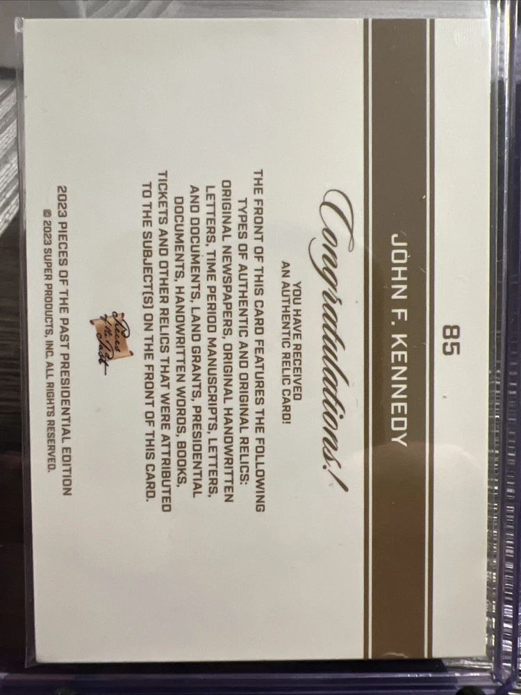 This 2023 Presidential Edition trading card features a print relic of John F. Kennedy, one of the most iconic figures in American history. The card is manufactured by Super Products Inc. and is an original, not a licensed reprint. It is a non-sport trading card with English language and is part of the US Presidents, Politics, and History franchises. The card is in excellent shape, near mint or better, and has features that make it stand out, including an insert and the featured person/artist, John F. Kennedy. It is a great addition to any collection, especially for those interested in collectibles related to American history and politics. The card is from the United States and was manufactured in 2023.