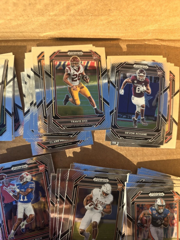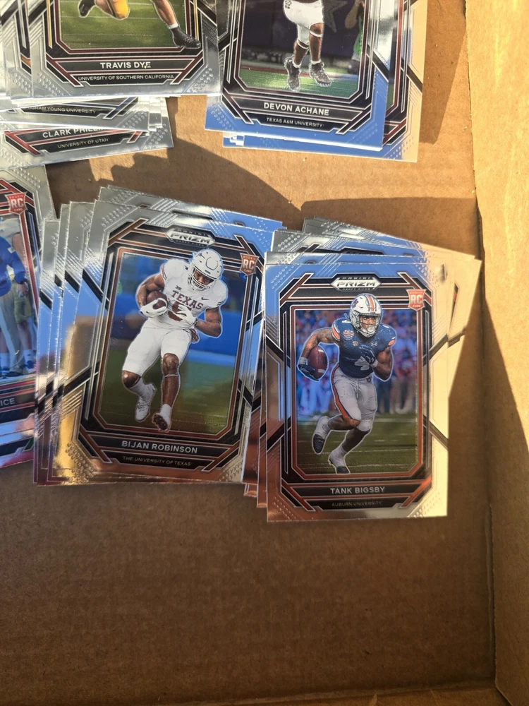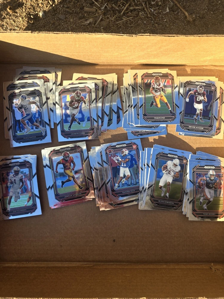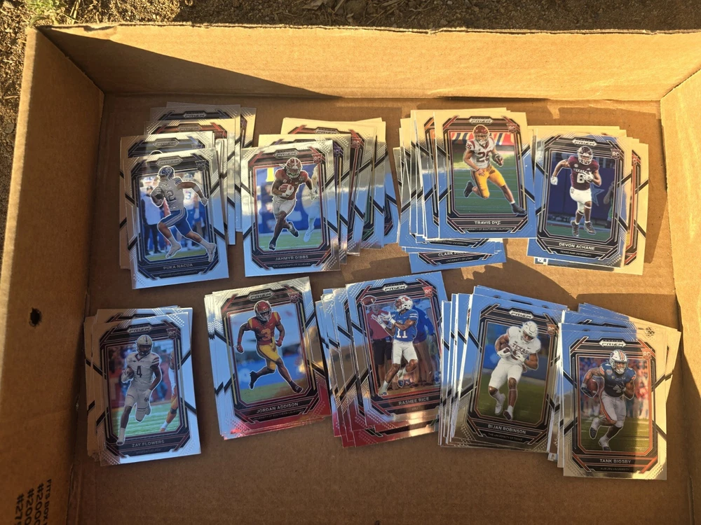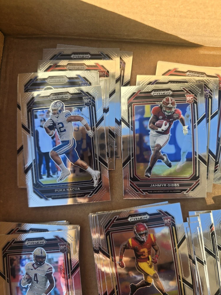 OVER 80 CARD LOT!! (Actually 92 rookie cards) ALL ROOKIES ALL THE BIGGEST NAMES.. CHEAPEST PRIZM ROOKIES YOU WILL FIND This 80+ card lot is a must-have for any football fan looking to add to their trading card collection. The 2023 Panini Prizm Draft Picks set features rookie cards of top players like Bijan Robinson, Jahmyr Gibbs, May Flowers, Tank Bigsby, Jordan Addison, Devon Achane, and Puka Nakua. The cards are perfect for collectors who want to complete their set and showcase their passion for the sport. Manufactured by Panini, the cards are of high quality and are sure to impress any collector. Don't miss out on this opportunity to own a piece of football history.