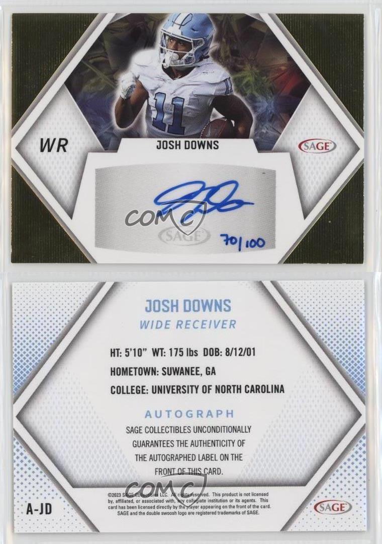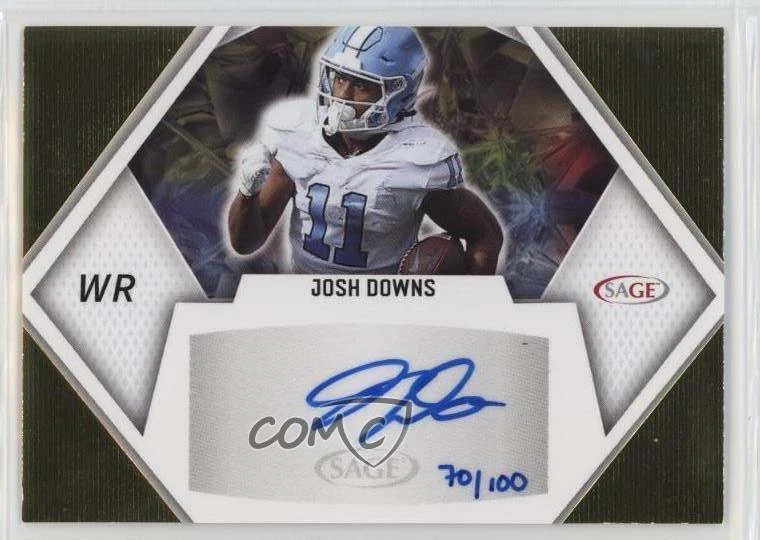 2023 SAGE High Series - Autographs - Gold #A-JD Josh Downs Qty Made: 100 - Rookie - Football Card - Featuring the North Carolina Tar Heels - Featuring Josh Downs Search for more: 2023 SAGE High Series Search for more: 2023 SAGE High Series - Autographs - Gold View all of our Listings Auctions Buy It Now About Us Located in the beautiful Pacific Northwest, COMC (Check Out My Cards) is the world's largest consignment service for trading card singles. More than 10,000 people have used our consignment service to list over 50 million trading cards. Find out how we can help you consign your items on eBay by contacting us through eBay messaging. COMC -- "The Safe & Easy Way to Buy & Sell" Representative Image - Select Specific Item above to see image of actual item Representative Image - Select Specific Item above to see image of actual item Raw Condition for Modern Cards Unless otherwise noted, raw modern cards are listed in Near Mint-Mint condition or better. A NM-MT card appears to be Mint at first glance, but upon closer inspection, may exhibit some of the following: minor print defects (e.g. roller marks, print line, dimple), minor scratches, slight edge wear, and slight corner wear. Centering is clearly visible in the images provided and does not factor into our condition assessment. Raw Condition for Vintage Cards Unless otherwise noted, raw vintage cards are listed in Excellent condition or better. An EX card may exhibit some of the following: minor rounding of corners, surface wear, print defects, light scratches, and slight edge wear/chipping. Centering is clearly visible in the images provided and does not factor into our condition assessment. Domestic Shipping Combined shipping for multiple items is available. To receive combined shipping, please ensure all desired items are in your eBay shopping cart before proceeding to checkout. eBay limits orders to 40 items per order. We automatically combine multiple orders placed on the same day. If you place multiple orders on the same day, please contact us to request a refund of applicable shipping costs. Signature confirmation may be required on invoices over $400. All cards are protected and shipped securely. International Shipping COMC offers eBay's International Shipping (EIS) for international orders under $2,500* (see country exceptions below). All duties and import fees are paid at checkout; in the rare event that there are additional import fees upon delivery, these are borne by the buyer. EIS packages route through a shipping hub in Erlanger, KY before shipping to their final destination. Please note that EIS does not allow for combined shipments. The shipping rates are determined by eBay and cannot be adjusted. *Maximum sale price exceptions: Colombia, Kuwait ($2,000); Taiwan ($1,539); Chile, Costa Rica, Guatemala, Honduras, Trinidad and Tobago ($1,000); Antigua and Barbuda, Aruba, Belize, Dominica, Grenada, Philippines, Saint Kitts and Nevis, Saint Lucia, Montserrat, Turks and Caicos Islands ($500); Dominican Republic, El Salvador ($200). Please request a shipping quote through eBay messaging for orders that exceed the maximum sale price supported by eBay's International Shipping. You will be responsible for all duties and import fees for international orders shipped outside the EIS. All cards are protected and shipped securely. Payment COMC does not accept offers on our cards through our eBay storefront. COMC utilizes eBay’s managed payments system. If you are experiencing difficulties making a payment, please contact eBay for assistance. Return Policy Returns are only accepted on the rare occasion the item is not as described. If you are making a return, please initiate the return process through eBay so a mailing label can be provided for you. Prior to listing, our expert team carefully assessed this item to represent it accurately. Please review the description and high-definition images prior to purchasing to ensure this item meets your satisfaction. We welcome you to contact us if you have further questions about this item. Trust and Integrity COMC carefully assesses each item consigned to us to prevent fraudulent items from entering the marketplace. If you believe an item offered on COMC may be fraudulent, please contact us with details so we can investigate the issue. Items we determine are outside our supported items policy may be removed. Last Modified: 1/28/2025 9:03:28 AM PDT