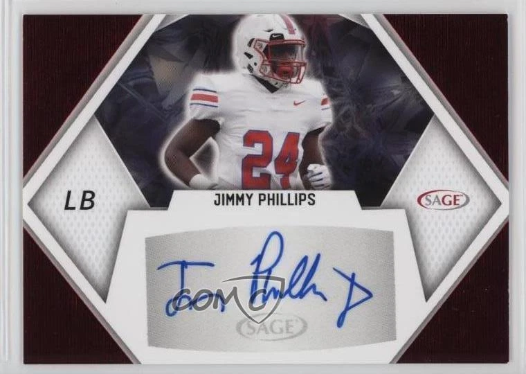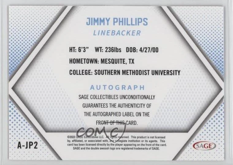 2023 SAGE High Series - Autographs - Red #A-JP2 Jimmy Phillips - Rookie - Football Card - Featuring the Southern Methodist Mustangs - Featuring Jimmy Phillips Jr. Search for more: 2023 SAGE High Series Search for more: 2023 SAGE High Series - Autographs - Red View all of our Listings Auctions Buy It Now About Us Located in the beautiful Pacific Northwest, COMC (Check Out My Cards) is the world's largest consignment service for trading card singles. More than 10,000 people have used our consignment service to list over 50 million trading cards. Find out how we can help you consign your items on eBay by contacting us through eBay messaging. COMC -- "The Safe & Easy Way to Buy & Sell" Representative Image - Select Specific Item above to see image of actual item Representative Image - Select Specific Item above to see image of actual item Raw Condition for Modern Cards Unless otherwise noted, raw modern cards are listed in Near Mint-Mint condition or better. A NM-MT card appears to be Mint at first glance, but upon closer inspection, may exhibit some of the following: minor print defects (e.g. roller marks, print line, dimple), minor scratches, slight edge wear, and slight corner wear. Centering is clearly visible in the images provided and does not factor into our condition assessment. Raw Condition for Vintage Cards Unless otherwise noted, raw vintage cards are listed in Excellent condition or better. An EX card may exhibit some of the following: minor rounding of corners, surface wear, print defects, light scratches, and slight edge wear/chipping. Centering is clearly visible in the images provided and does not factor into our condition assessment. Domestic Shipping Combined shipping for multiple items is available. To receive combined shipping, please ensure all desired items are in your eBay shopping cart before proceeding to checkout. eBay limits orders to 40 items per order. We automatically combine multiple orders placed on the same day. If you place multiple orders on the same day, please contact us to request a refund of applicable shipping costs. Signature confirmation may be required on invoices over $400. All cards are protected and shipped securely. International Shipping COMC offers eBay's International Shipping (EIS) for international orders under $2,500* (see country exceptions below). All duties and import fees are paid at checkout; in the rare event that there are additional import fees upon delivery, these are borne by the buyer. EIS packages route through a shipping hub in Erlanger, KY before shipping to their final destination. Please note that EIS does not allow for combined shipments. The shipping rates are determined by eBay and cannot be adjusted. *Maximum sale price exceptions: Colombia, Kuwait ($2,000); Taiwan ($1,539); Chile, Costa Rica, Guatemala, Honduras, Trinidad and Tobago ($1,000); Antigua and Barbuda, Aruba, Belize, Dominica, Grenada, Philippines, Saint Kitts and Nevis, Saint Lucia, Montserrat, Turks and Caicos Islands ($500); Dominican Republic, El Salvador ($200). Please request a shipping quote through eBay messaging for orders that exceed the maximum sale price supported by eBay's International Shipping. You will be responsible for all duties and import fees for international orders shipped outside the EIS. All cards are protected and shipped securely. Payment COMC does not accept offers on our cards through our eBay storefront. COMC utilizes eBay’s managed payments system. If you are experiencing difficulties making a payment, please contact eBay for assistance. Return Policy Returns are only accepted on the rare occasion the item is not as described. If you are making a return, please initiate the return process through eBay so a mailing label can be provided for you. Prior to listing, our expert team carefully assessed this item to represent it accurately. Please review the description and high-definition images prior to purchasing to ensure this item meets your satisfaction. We welcome you to contact us if you have further questions about this item. Trust and Integrity COMC carefully assesses each item consigned to us to prevent fraudulent items from entering the marketplace. If you believe an item offered on COMC may be fraudulent, please contact us with details so we can investigate the issue. Items we determine are outside our supported items policy may be removed. Last Modified: 1/30/2025 5:07:02 PM PDT