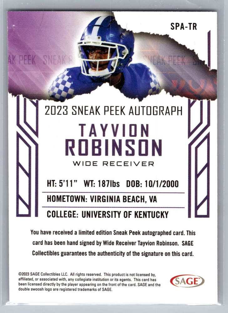 This is a nice example of a 2023 SAGE HIT #SPA-TR Tayvion Robinson Sneak Peek Autographs Red (Low Series) Other important information about this card: AU In 2023 Tayvion Robinson played for the Kentucky Wildcats. Please check out our other listings for more great cards.