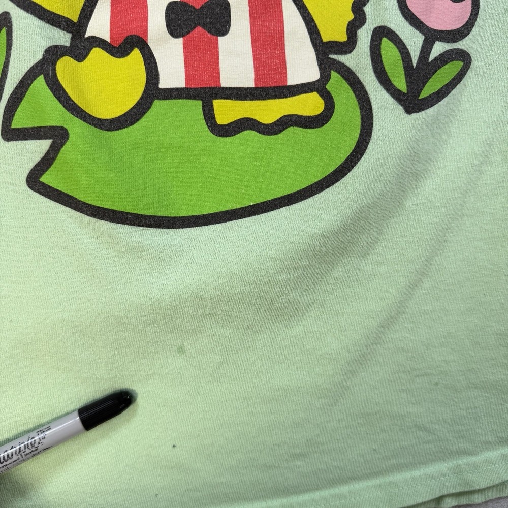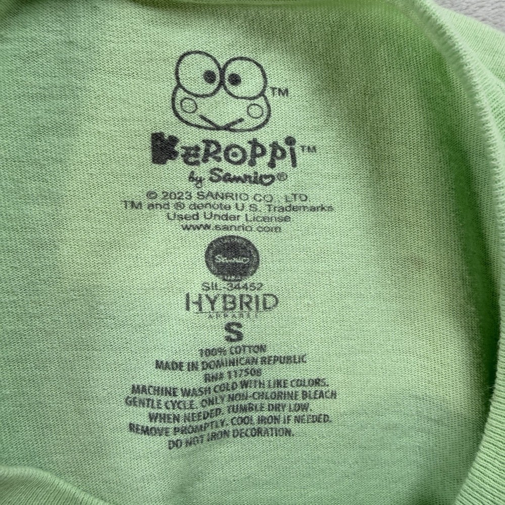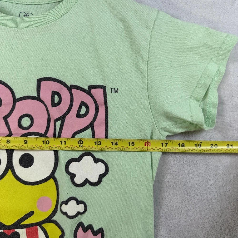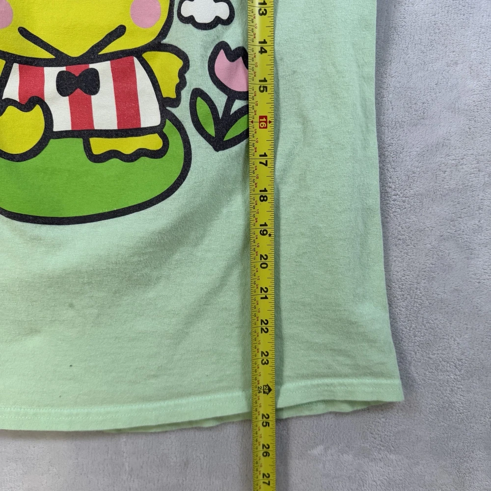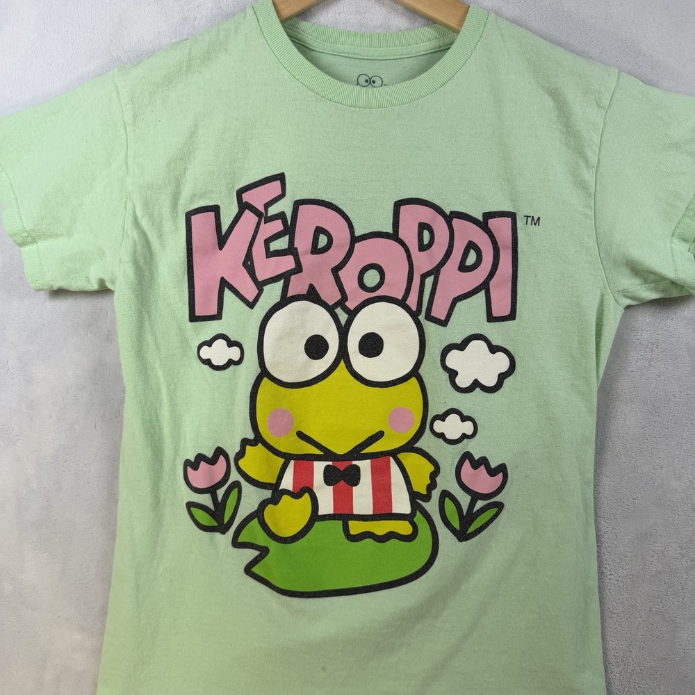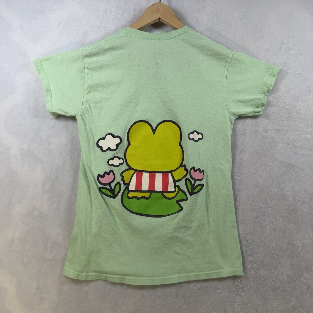 The 2023 Sanrio Keroppi Double Sided Green T-Shirt in size S is a stylish and fun women's top featuring the iconic Keroppi character from Sanrio. This regular fit t-shirt is perfect for fans of the brand and is made in a vibrant green color that is sure to stand out. The double-sided design adds an extra touch of cuteness to this must-have addition to any quirky wardrobe.