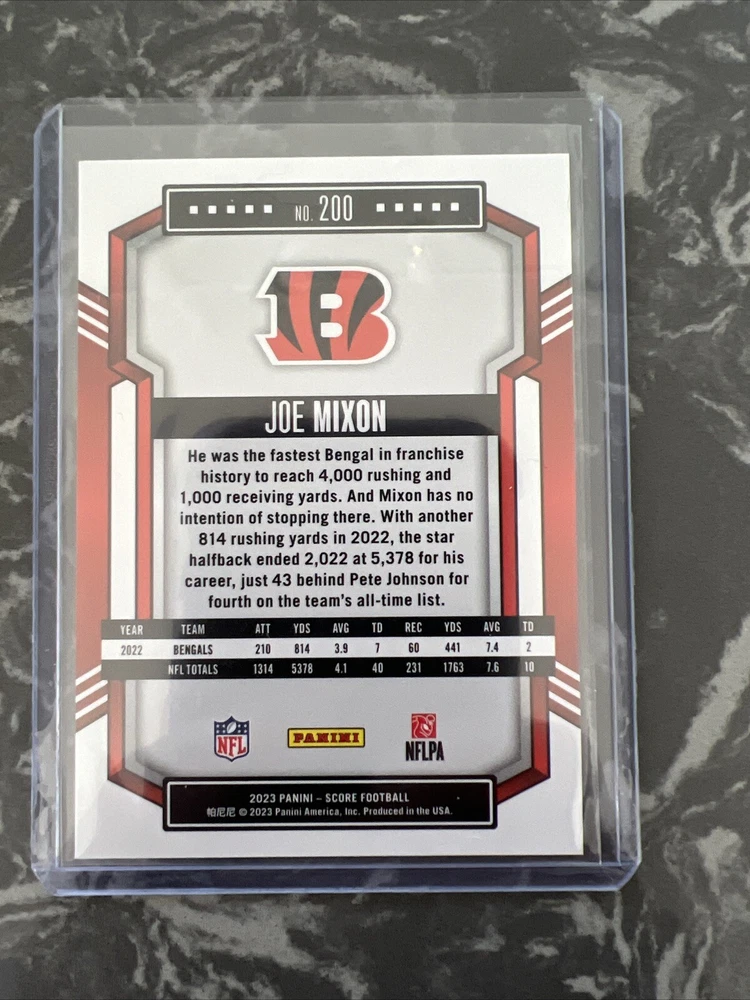 Sport: Football League: National Football League (NFL) Team: Cincinnati Bengals Season: 2023 Set: 2023 Score Manufacturer: Panini Card Number: 200 Type: Sports Trading Card Player/Athlete: Joe Mixon