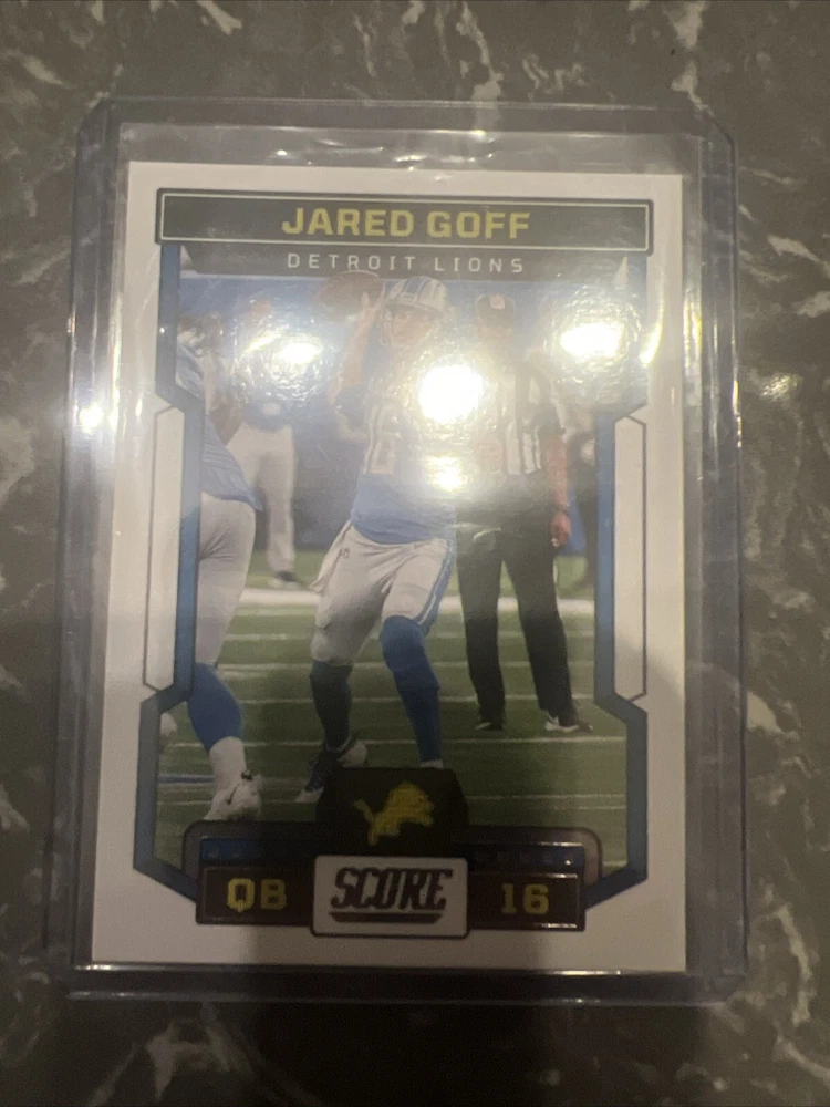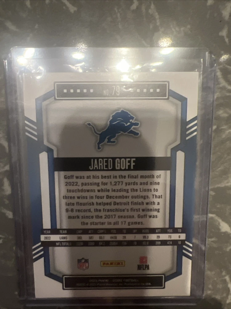 Team: Detroit Lions League: National Football League (NFL) Card Number: 79 Type: Sports Trading Card Manufacturer: Panini Sport: Football Set: 2023 Score Player/Athlete: Jared Goff Season: 2023