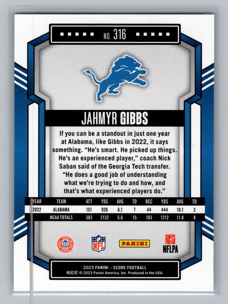 Graded: No Team: Detroit Lions Features: RC Manufacturer: Score Sport: FOOTBALL Set: 2023 Score Type: Sports Trading Card Season: 2023 Autographed: No Card Number: 316 Year Manufactured: 2023 League: NFL Player/Athlete: Jahmyr Gibbs