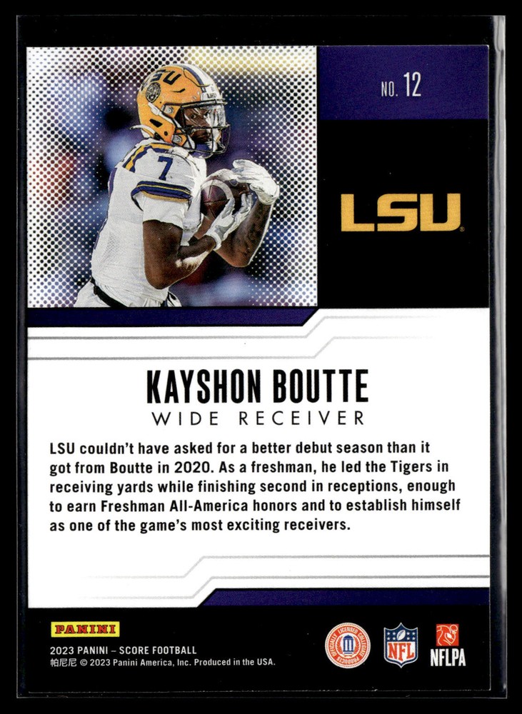 The Card pictured is the card you will receive unless there are multiple quantities then you will receive a card in the comparable grade. Cards in poor condition could have creasing, stains, rounded corners, pen marks or a combo of them. please see pics for a better understanding of cards condition. Excellent LSU Tigers Protential Kayshon Boutte #12 2023 Score Score 2023 Football .