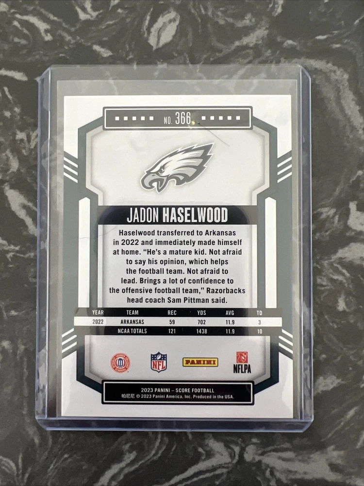 This 2023 Score card features Jadon Haselwood of the Philadelphia Eagles. The card is from the Rookies Scorecard set and has a card number of 366. It is a sports trading card with a Scorecard parallel/variety and is manufactured by Panini. The card is near mint or better and is a great addition to any collection. The card is specifically designed for fans of the National Football League (NFL) and collectors of sports trading cards. It includes features such as the rookie status of the player and the season in which it is being played. This card is a must-have for any fan or collector looking to add to their collection.