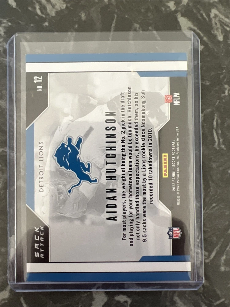Team: Detroit Lions Set: 2023 Score Card Number: 12 Season: 2023 Player/Athlete: Aidan Hutchinson Type: Sports Trading Card Manufacturer: Panini League: National Football League (NFL) Sport: Football