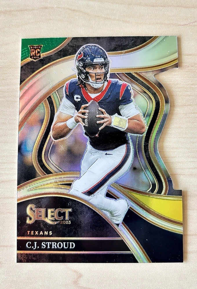 This 2023 Panini Select sports trading card features C.J. Stroud rookie card for the Houston Texans and Ohio State Buckeyes. The card is a die-cut parallel variety with a card number of 289. It is a club level green yellow prizm card that is near mint or better in condition, and it is ungraded. The card is not autographed and is a great addition to any football fan's collection.