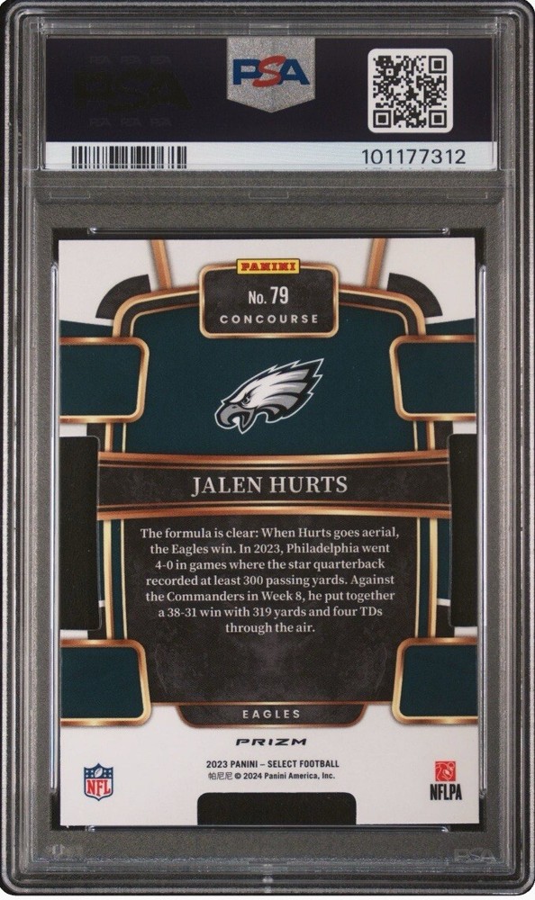 A 2023 Panini Select Jalen Hurts Die-Cut Red & Blue Prizm trading card graded a Gem Mint 10 by Professional Sports Authenticator (PSA). This card features a parallel variety design with a print run of 2. It is an original card manufactured in the United States for the National Football League (NFL) representing the Philadelphia Eagles. This card is a sought-after collectible for fans of football trading cards.