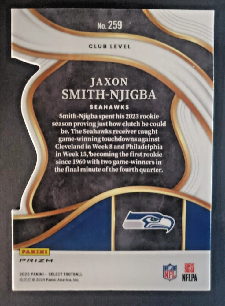 Type: Sports Trading Card Card Number: 259 Manufacturer: Select Features: Rookie Parallel/Variety: Die-Cut League: National Football League (NFL) Player/Athlete: Jaxon Smith-Njigba Team: Seattle Seahawks Set: 2023 Select Season: 2023 Sport: Football