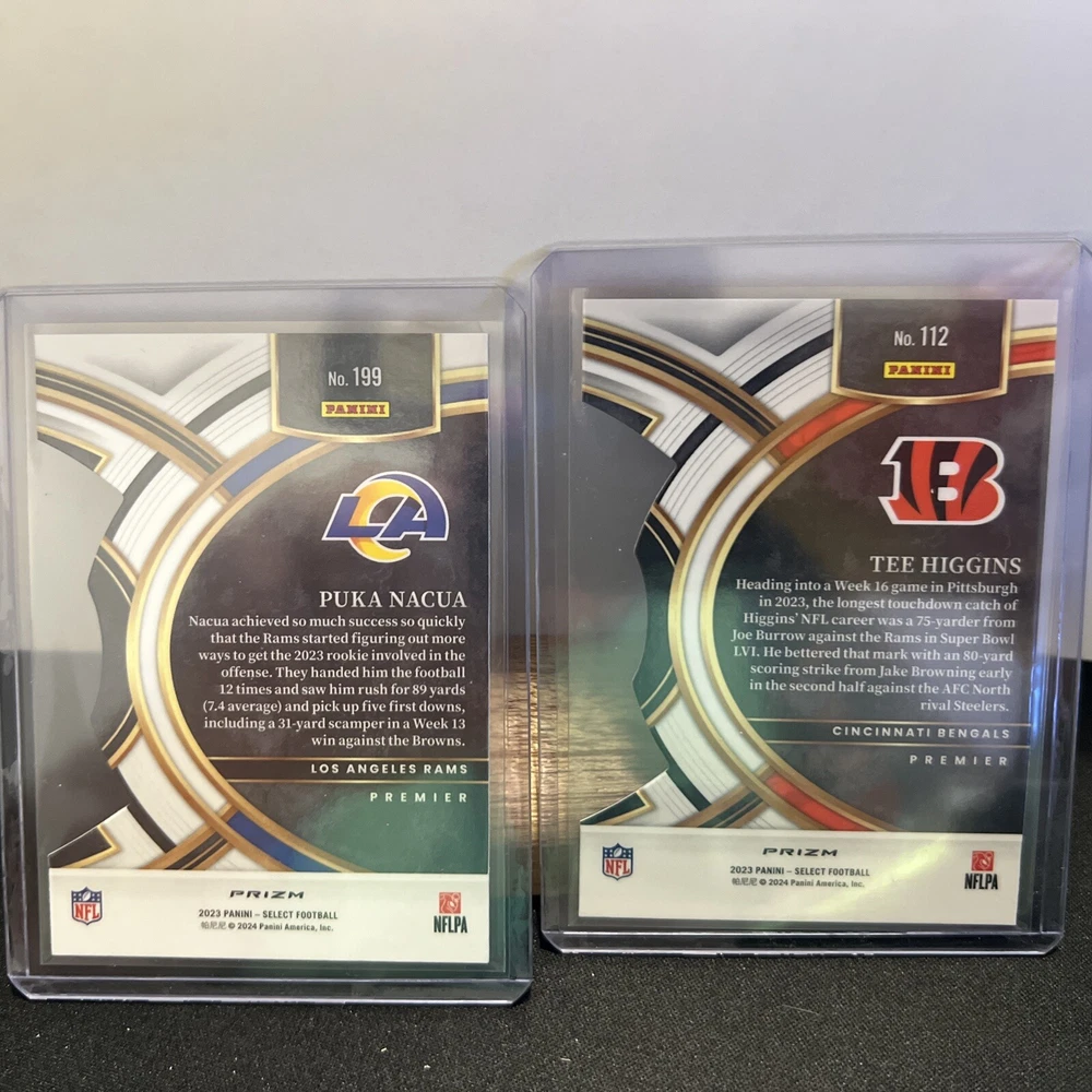 This 2023 Select Premier Level silver and red and yellow Die-Cut trading card features Tee Higgins and Puka Nacua, players for the Cincinnati Bengals and Los Angeles Rams respectively. The card is part of the 2023 Select set and has a print run of /299. This exclusive Rookie card is perfect for any football fan and collector, with its hologram and parallel/variety features. The card is manufactured by Select and has a card number of 199 and 112. Don't miss out on the opportunity to add this rare and unique card to your collection.
