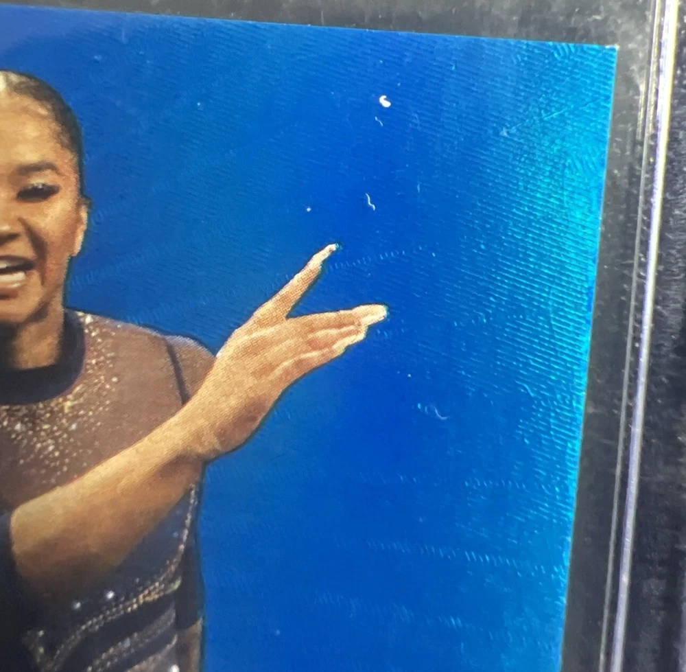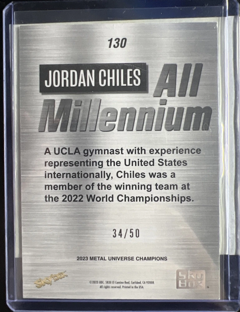 This is a rare 2023 Skybox Metal Universe Champions Jordan Chiles gymnastics Olympics trading card, featuring a precious metal gems blue parallel/variety. The card is a rookie card and is numbered 34/50. It is manufactured by Upper Deck in the United States and is made of high-quality paper material. The card size is standard and the sport is multi-sports. The language is English and the season is 2023. This card is a must-have for any collector or fan of sports trading cards. Please note there is a white spot on the upper right corner I’ve zoomed in on. And the back upper left corner is soft. Sold as is. Her and Simone biles just captured the gold this Olympics.