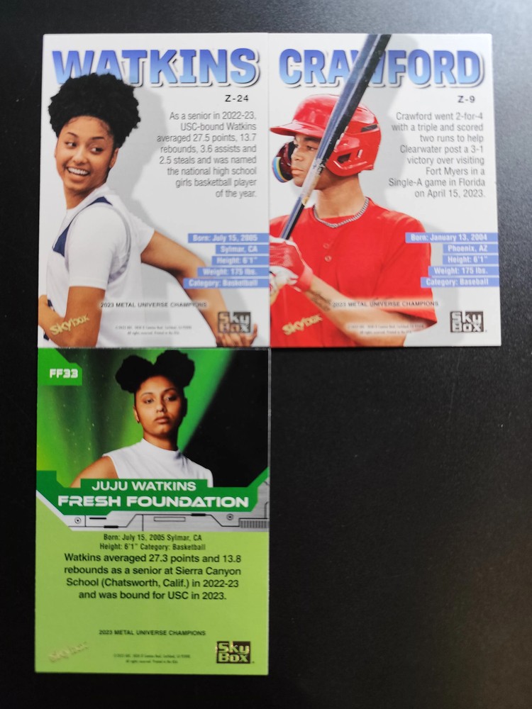 This Juju Watkins lot is a must-have for any collector! The Skybox Metal Universe design makes these cards pop with vibrant colors and an ultra-modern feel. The Fresh Foundation series always delivers top-notch quality, and this trio is no exception—crisp edges, sharp printing, and that signature metallic sheen. A fantastic addition for fans of the game and serious card enthusiasts alike. Snag them before they're gone!