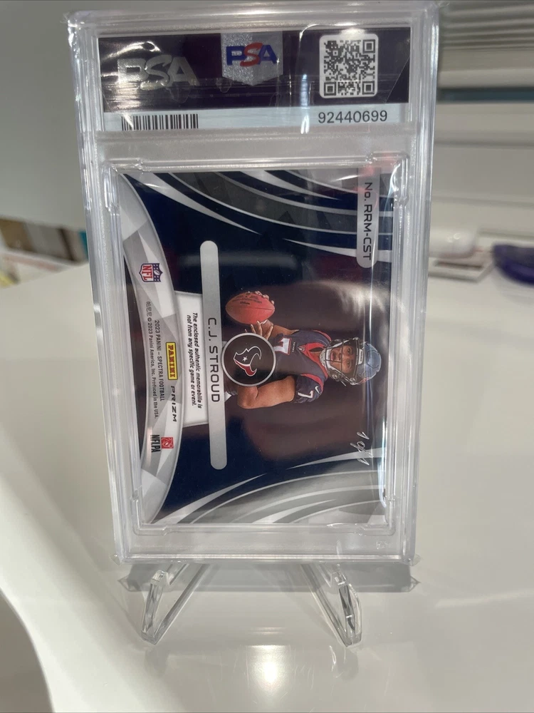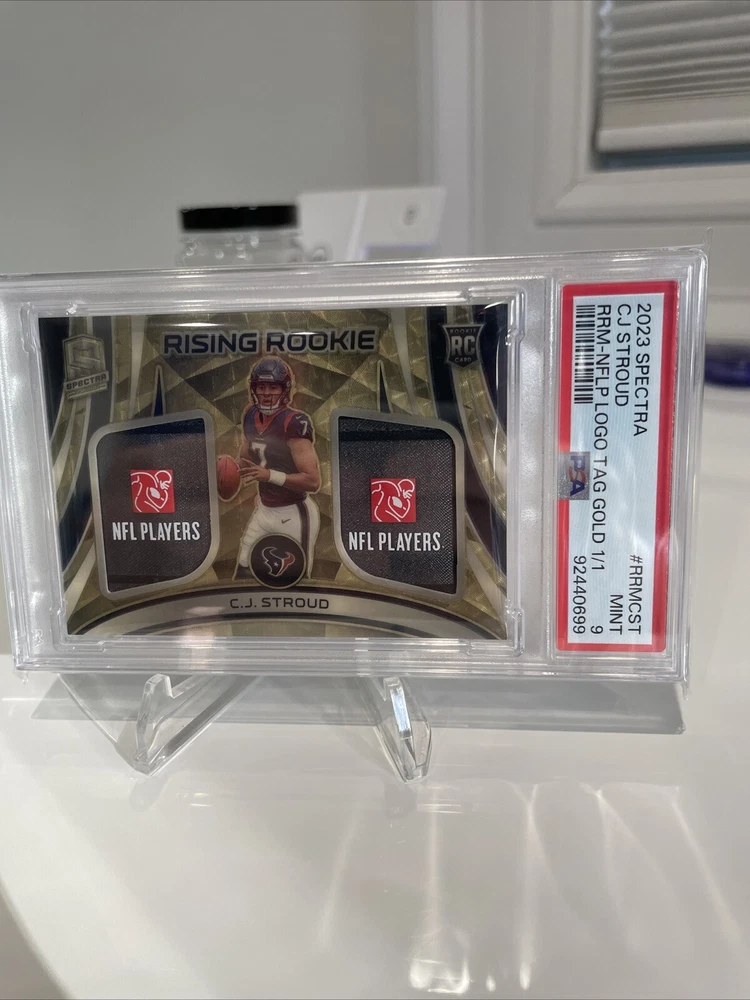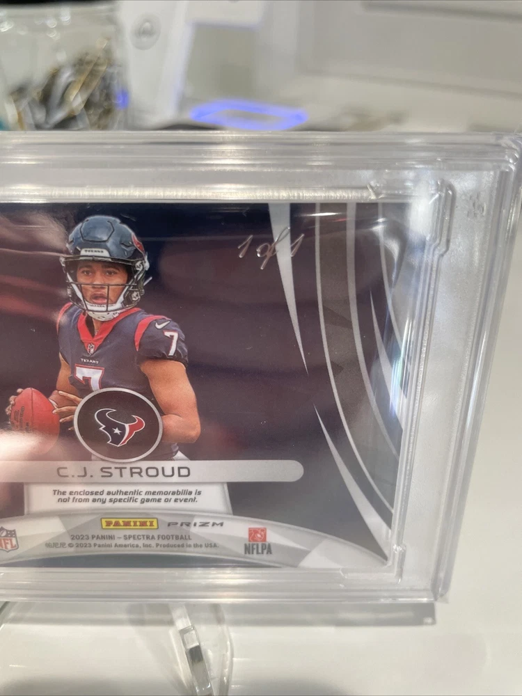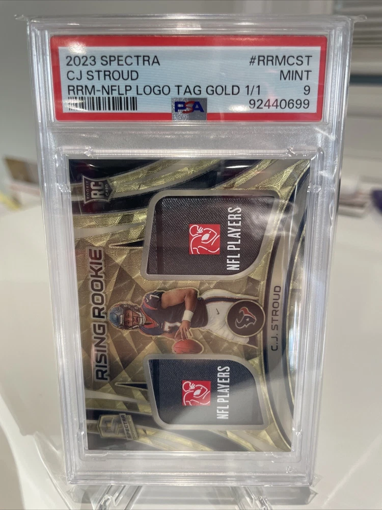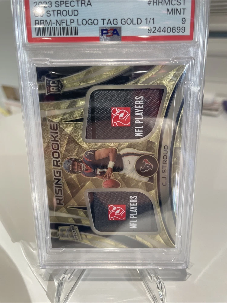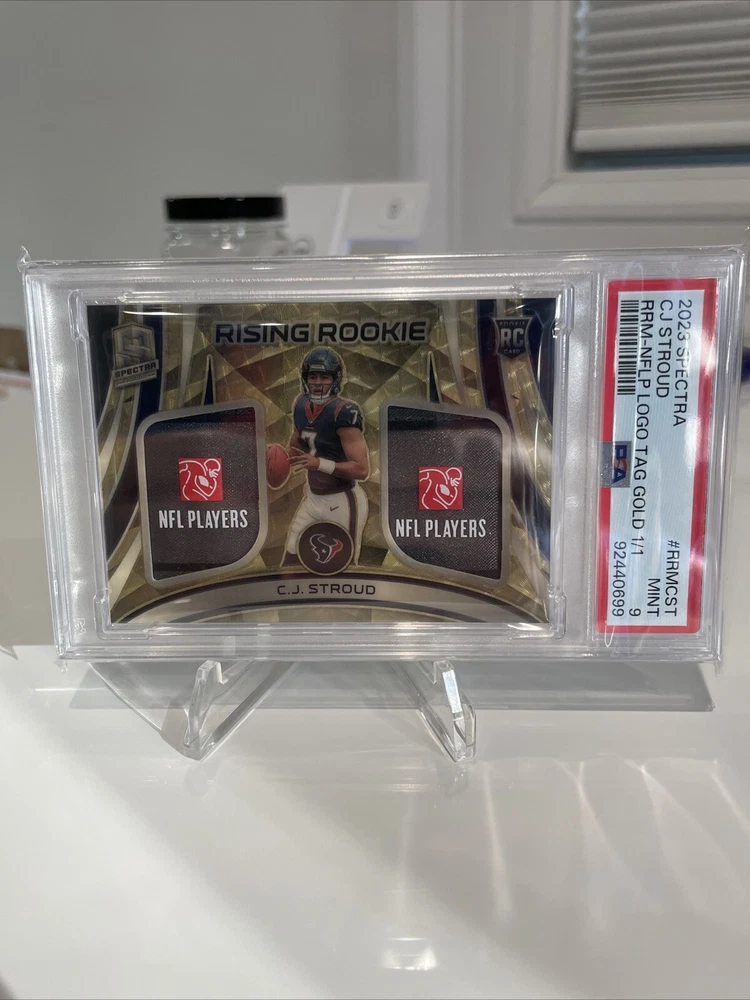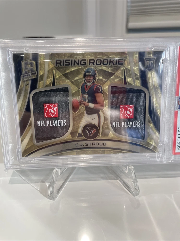 This rare and highly sought-after 2023 Spectra CJ Stroud RC trading card is a must-have for any serious collector. Featuring a stunning gold parallel design and the official NFL logo tag, this card is sure to be a standout addition to your collection. As a rookie card, this piece showcases the incredible talent and potential of C.J. Stroud, making it a valuable investment for any football fan. Don't miss your chance to own a piece of history with this 2023 Spectra CJ Stroud RC trading card.