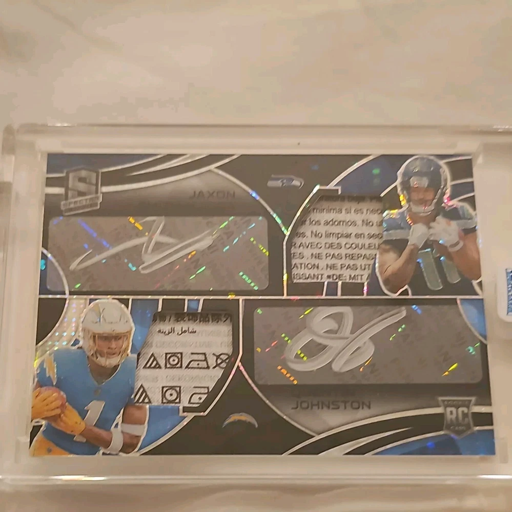 This rare 2023 Spectra Jaxon Smith-Njigba/Quentin Johnston trading card features a dual patch autograph and is numbered out of 10. The card is part of the National Football League (NFL) collection by Panini and is ungraded. It includes a laundry tag and is silver ink. The card is perfect for collectors who are looking for a unique and rare item to add to their collection. It features the Seattle Seahawks and Los Angeles Chargers team logos and is a great piece for any football fan.