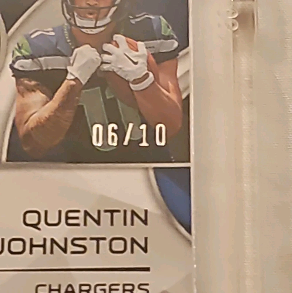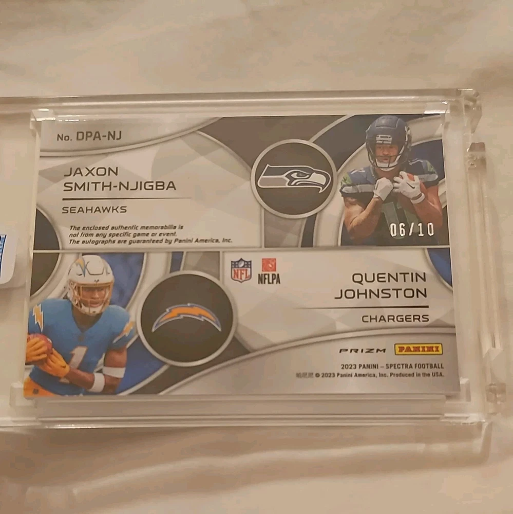 Parallel/Variety: Laundry Tag Card Number: DPA-NJ Autographed: Yes Manufacturer: Panini Type: Sports Trading Card Sport: Football Print Run: 10 Team: Los Angeles Chargers, Seattle Seahawks Season: 2023 Features: Memorabilia, Parallel/Variety, Rookie, Serial Numbered, silver ink, laundry tag League: National Football League (NFL) Player/Athlete: Jaxon Smith-Njigba, Quentin Johnston Year Manufactured: 2023
