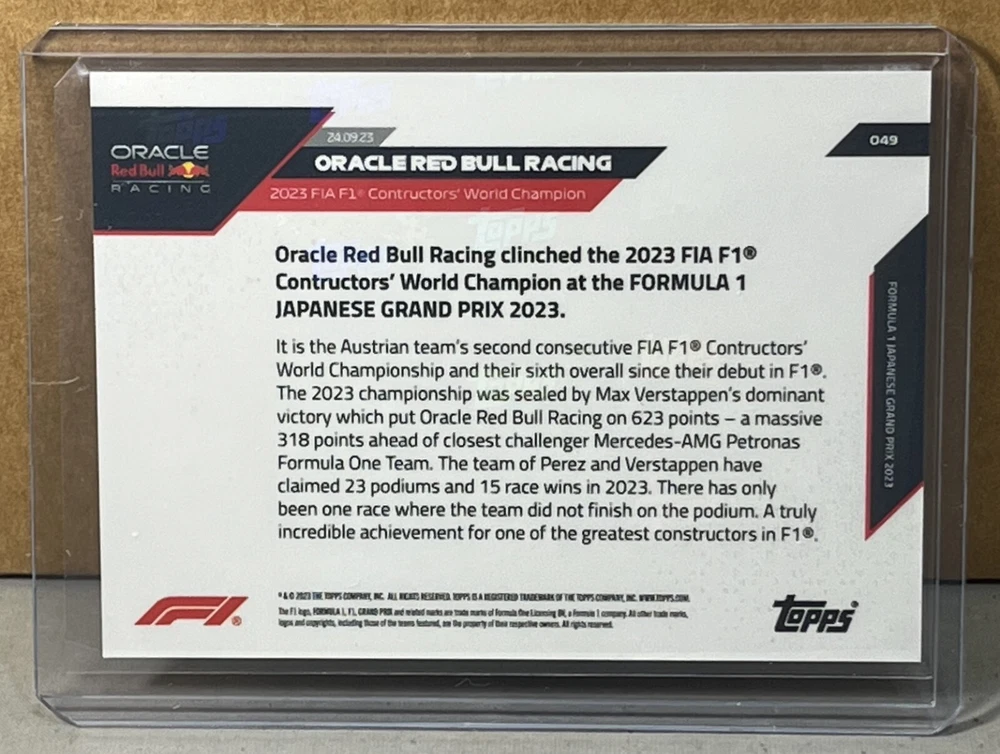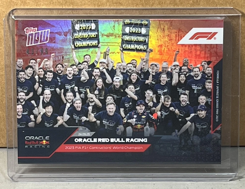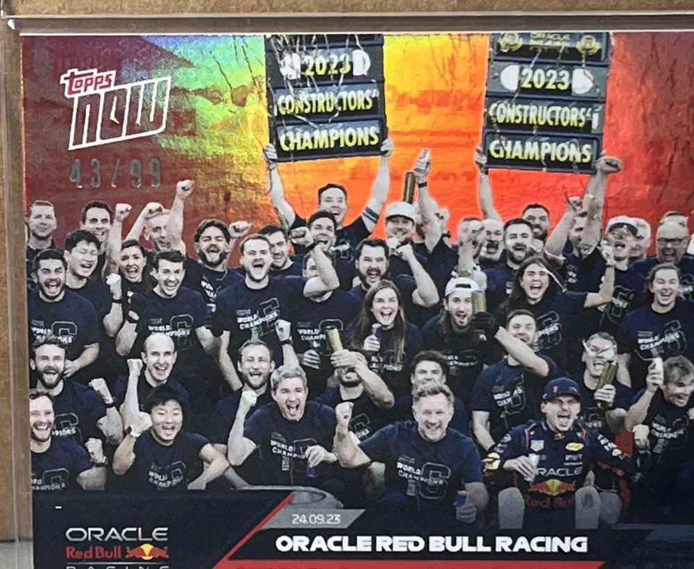 2023 TOPPS NOW FORMULA 1 F1 #49 ORACLE RED BULL RACING 2023 FIA F1 Constructors' World Champion Rainbow Foil Red parallel serial #'d 43/99. Worldwide shipping available. U.S. - Winning bidder to add $3.99 for careful USPS first class shipping with delivery confirmation. Add .50 for each additional item. All other countries - ship costs are calculated by eBay through international shipping program. Please message if interested in multiple items. Bid with confidence, 49000+ feedback. Thanks and check out my auctions ending every Sunday. Please note that combined ship rates are for items paid for on one invoice, thanks!