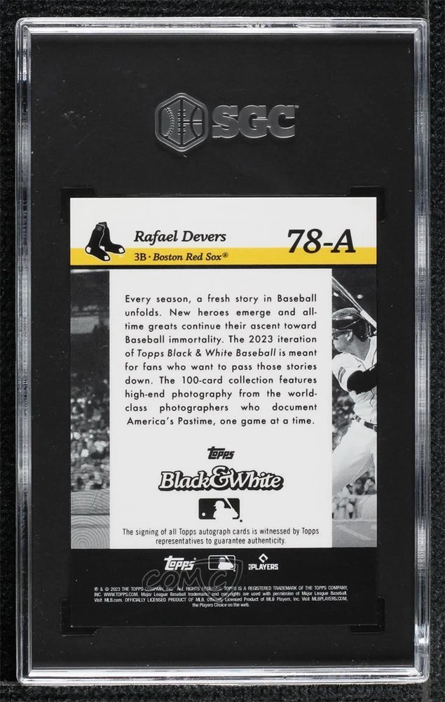 2023 Topps Black & White - [Base] - Sepia Filter Autographs #78-A Rafael Devers Qty Made: 75 Graded SGC 10 GEM - Baseball Card - Featuring the Boston Red Sox - Featuring Rafael Devers Search for more: 2023 Topps Black & White Search for more: 2023 Topps Black & White - [Base] - Sepia Filter Autographs View all of our Listings Auctions Buy It Now About Us Located in the beautiful Pacific Northwest, COMC (Check Out My Cards) is the world's largest consignment service for trading card singles. More than 10,000 people have used our consignment service to list over 50 million trading cards. We currently house 20 million cards, each listed for sale with front and back images of the actual card. Find out how we can help you consign your items on eBay by contacting us through eBay messaging. COMC -- "The Safe & Easy Way to Buy & Sell" Representative Image - Select Specific Item above to see image of actual item Representative Image - Select Specific Item above to see image of actual item Raw Condition for Modern Cards Unless otherwise noted, raw modern cards are listed in Near Mint-Mint condition or better. A NM-MT card appears to be Mint at first glance, but upon closer inspection, may exhibit some of the following: minor print defects (e.g. roller marks, print line, dimple), minor scratches, slight edge wear, and slight corner wear. Centering is clearly visible in the images provided and does not factor into our condition assessment. Raw Condition for Vintage Cards Unless otherwise noted, raw vintage cards are listed in Excellent condition or better. An EX card may exhibit some of the following: minor rounding of corners, surface wear, print defects, light scratches, and slight edge wear/chipping. Centering is clearly visible in the images provided and does not factor into our condition assessment. Domestic Shipping Combined shipping for multiple items is available. To receive combined shipping, please ensure all desired items are in your eBay shopping cart before proceeding to checkout. eBay limits orders to 40 items per order. We automatically combine multiple orders placed on the same day. If you place multiple orders on the same day, please contact us to request a refund of applicable shipping costs. Signature confirmation may be required on invoices over $400. Raw cards are shipped in toploaders. International Shipping COMC offers eBay's International Shipping (EIS) for international orders under $2,500* (see country exceptions below). All duties and import fees are paid at checkout; in the rare event that there are additional import fees upon delivery, these are borne by the buyer. EIS packages route through a shipping hub in Erlanger, KY before shipping to their final destination. Please note that EIS does not allow for combined shipments. The shipping rates are determined by eBay and cannot be adjusted. *Maximum sale price exceptions: Colombia, Kuwait ($2,000); Taiwan ($1,539); Chile, Costa Rica, Guatemala, Honduras, Trinidad and Tobago ($1,000); Antigua and Barbuda, Aruba, Belize, Dominica, Grenada, Philippines, Saint Kitts and Nevis, Saint Lucia, Montserrat, Turks and Caicos Islands ($500); Dominican Republic, El Salvador ($200). Please request a shipping quote through eBay messaging for orders that exceed the maximum sale price supported by eBay's International Shipping. You will be responsible for all duties and import fees for international orders shipped outside the EIS. Raw cards are shipped in toploaders. Payment COMC does not accept offers on our cards through our eBay storefront. COMC utilizes eBay’s managed payments system. If you are experiencing difficulties making a payment, please contact eBay for assistance. Return Policy Returns are only accepted on the rare occasion the item is not as described. If you are making a return, please initiate the return process through eBay so a mailing label can be provided for you. Prior to listing, our expert team carefully assessed this item to represent it accurately. Please review the description and high-definition images prior to purchasing to ensure this item meets your satisfaction. We welcome you to contact us if you have further questions about this item. Trust and Integrity COMC carefully assesses each item consigned to us to prevent fraudulent items from entering the marketplace. If you believe an item offered on COMC may be fraudulent, please contact us with details so we can investigate the issue. Items we determine are outside our supported items policy may be removed. Last Modified: 10/22/2024 8:02:58 PM PDT