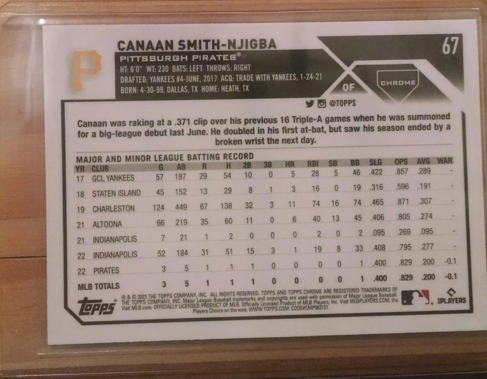 This is a 2023 Topps Chrome trading card featuring Canaan Smith-Njigba of the Pittsburgh Pirates. The card is part of the base set and is a rookie card. It has a card number of 67 and was manufactured by Topps in 2023. The card is a sports trading card and is ideal for baseball fans. It is perfect for those collecting cards of Major League (MLB) players. The card is RAW, but will ship in a penny sleeve and top loader to maintain its existing condition. The set is known for its high-quality cards and is a must-have for collectors.