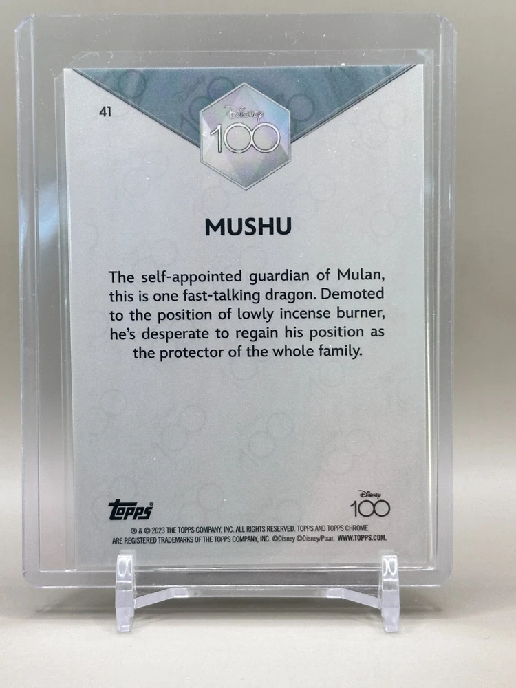 Delve into the enchanting world of Disney with the 2023 Topps Chrome Disney 100 #41 Mushu Purple card, a collectible treasure limited to just 299 pieces. This exquisite piece showcases Mushu, the beloved dragon from Disney's classic Fantasia, rendered in vibrant purple hues that capture the spirit of the legendary animated film. Crafted with the quality and care that Topps is known for, this non-sport trading card is a must-have for Disney aficionados and trading card collectors alike. Its rarity and the iconic nature of the Disney franchise make it a standout addition to any collection. Embrace the magic of Disney with this captivating collectible.
