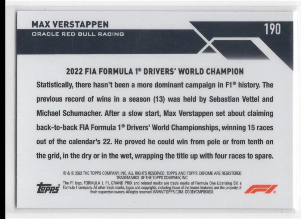 Autographed: No Graded: No Set: Topps Chrome Formula 1 Award Winners Card Name: 2023 Topps Chrome Formula 1 Award Winners Max Verstappen Oracle R Team: Oracle Red Bull Racing Type: Unspecified Franchise: Racing Sport: Racing Card Number: 190 Season: 2023 Character: Max Verstappen Vintage: No Player/Athlete: Max Verstappen Game: Unspecified Year Manufactured: 2023 Original/Licensed Reprint: Original Card Size: 3½" x 2½"