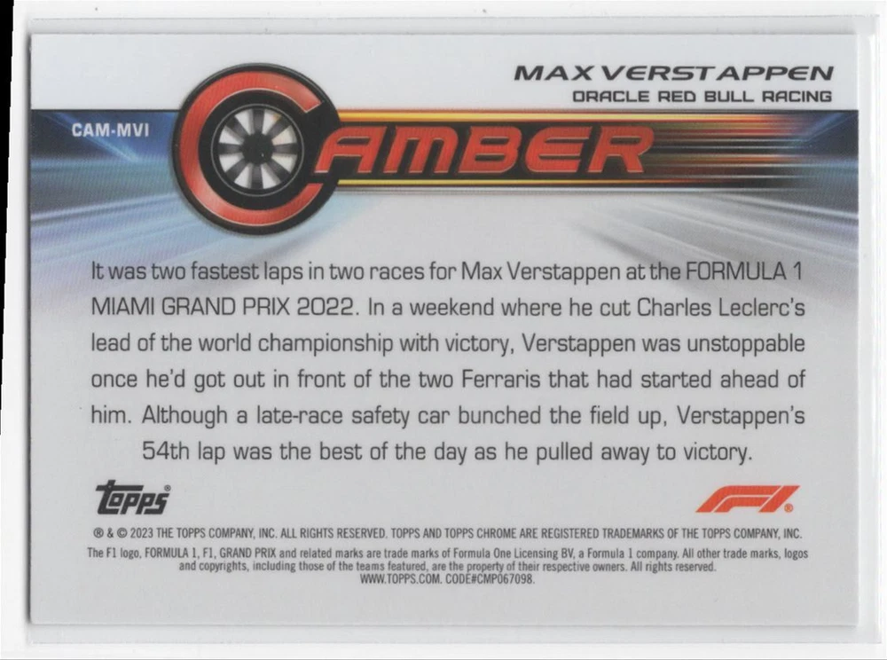 About Me Other Listings Feedback Add to Favorites Contact Me Striking Cards 901 2023 Topps Chrome Formula 1 Camber Max Verstappen Oracle Red Bull Racing No stock photo / These are real scans or pictures Details Description: Max Verstappen Category: Racing Year: 2023 Product: Topps Chrome Formula 1 Camber Team: Oracle Red Bull Racing Card Number: CAM-MVI Dimensions: 3½" x 2½" SKU: RA B0001 R01 B (196) Listing By Kronocard trading cards software v2.7.0.1