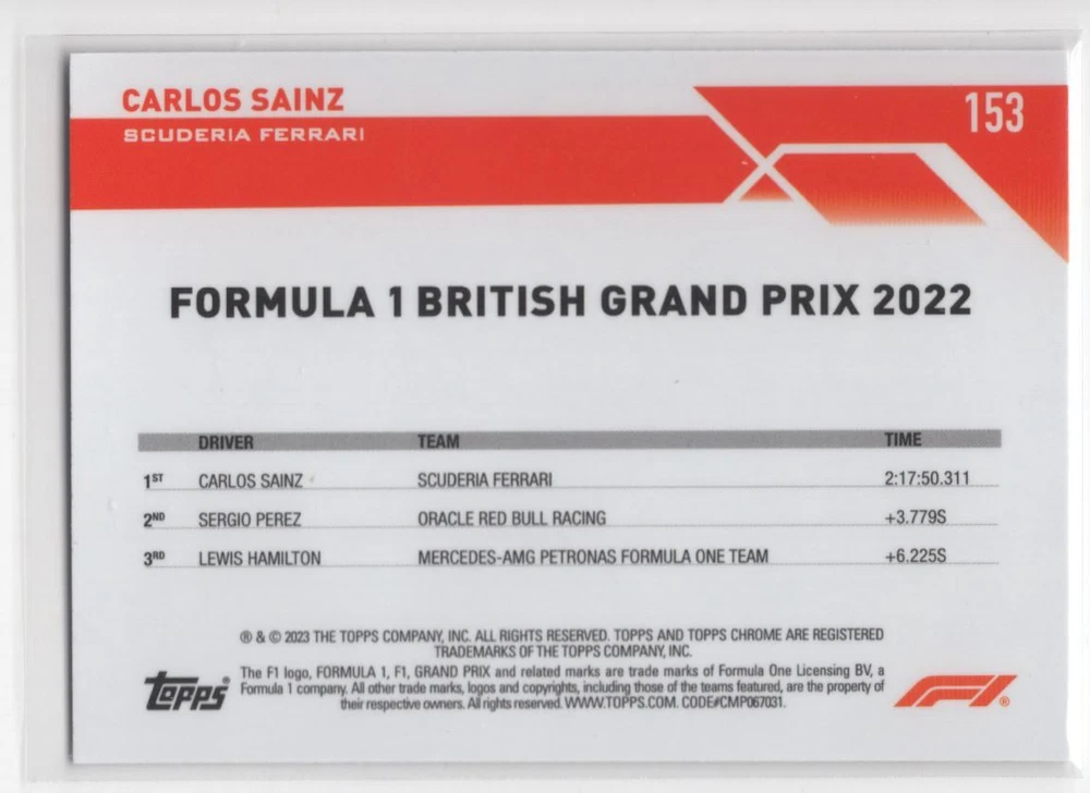 About Me Other Listings Feedback Add to Favorites Contact Me Striking Cards 901 2023 Topps Chrome Formula 1 Carlos Sainz Scuderia Ferrari #153 No stock photo / These are real scans or pictures Details Description: Carlos Sainz Category: Racing Year: 2023 Product: Topps Chrome Formula 1 Team: Scuderia Ferrari Card Number: 153 Dimensions: 3¾" x 2½" SKU: RA B0001 R01 B (155) Listing By Kronocard trading cards software v2.7.0.1