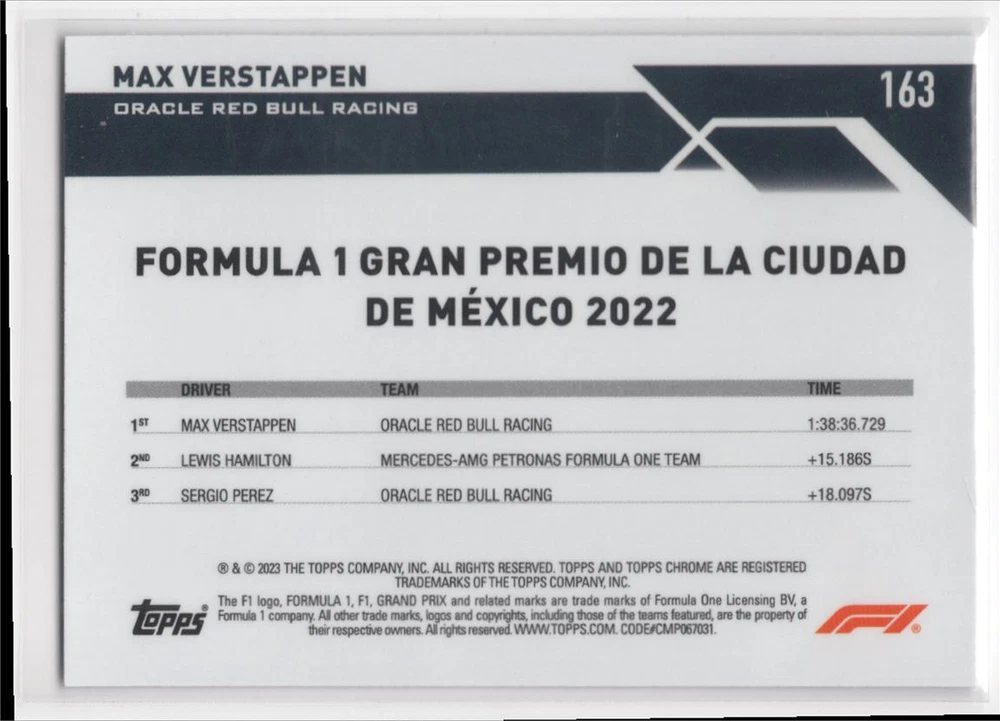 Card Number: 163 Card Size: 3½" x 2½" Vintage: No Season: 2023 Set: Topps Chrome Formula 1 Player/Athlete: Max Verstappen Original/Licensed Reprint: Original Autographed: No Year Manufactured: 2023 Game: Unspecified Team: Oracle Red Bull Racing Card Name: 2023 Topps Chrome Formula 1 Max Verstappen Oracle Red Bull Racing Type: Unspecified Graded: No Character: Max Verstappen Franchise: Racing Sport: Racing