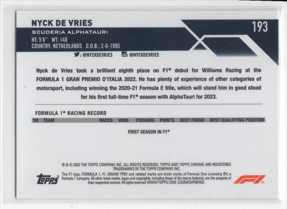 2023 Topps Chrome Formula 1 Nyck De Vries Rookie Scuderia AlphaTauri #193