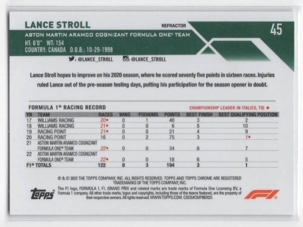 About Me Other Listings Feedback Add to Favorites Contact Me Striking Cards 901 2023 Topps Chrome Formula 1 Refractor Lance Stroll Aston Martin Aramco Cognizant No stock photo / These are real scans or pictures Details Description: Lance Stroll Category: Racing Year: 2023 Product: Topps Chrome Formula 1 Refractor Team: Aston Martin Aramco Cognizant F1 Team Card Number: 45 Dimensions: 3½" x 2½" SKU: RA B0001 R01 B (180) Listing By Kronocard trading cards software v2.7.0.1
