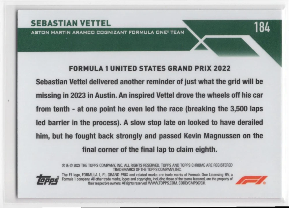 Game: Unspecified Original/Licensed Reprint: Original Team: Aston Martin Aramco Cognizant F1 Team Autographed: No Type: Unspecified Graded: No Year Manufactured: 2023 Character: Sebastian Vettel Franchise: Racing Card Number: 184 Set: Topps Chrome Formula 1 Player/Athlete: Sebastian Vettel Card Size: 3¾" x 2½" Sport: Racing Card Name: 2023 Topps Chrome Formula 1 Sebastian Vettel Aston Martin Aramco Season: 2023 Vintage: No