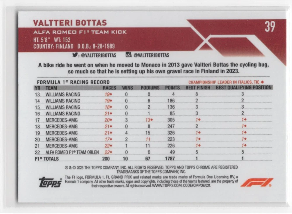 About Me Other Listings Feedback Add to Favorites Contact Me Striking Cards 901 2023 Topps Chrome Formula 1 Valtteri Bottas Alfa Romeo F1 Team Kick #39 No stock photo / These are real scans or pictures Details Description: Valtteri Bottas Category: Racing Year: 2023 Product: Topps Chrome Formula 1 Team: Alfa Romeo F1 Team Kick Card Number: 39 Dimensions: 3½" x 2½" SKU: RA B0001 R01 B (157) Listing By Kronocard trading cards software v2.7.0.1