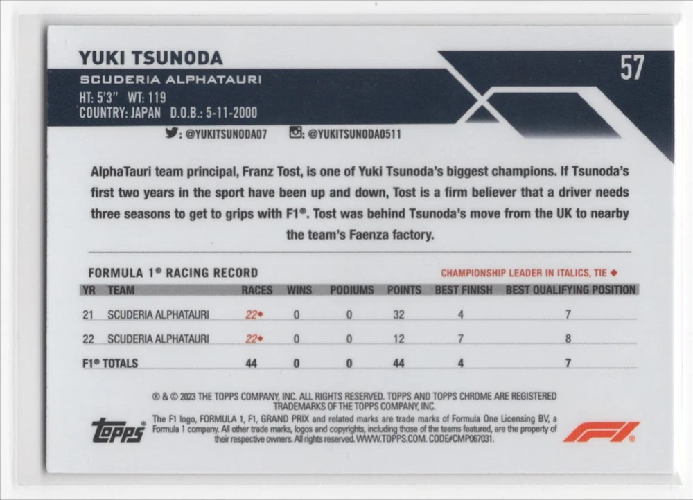 2023 Topps Chrome Formula 1 Yuki Tsunoda Scuderia AlphaTauri #57