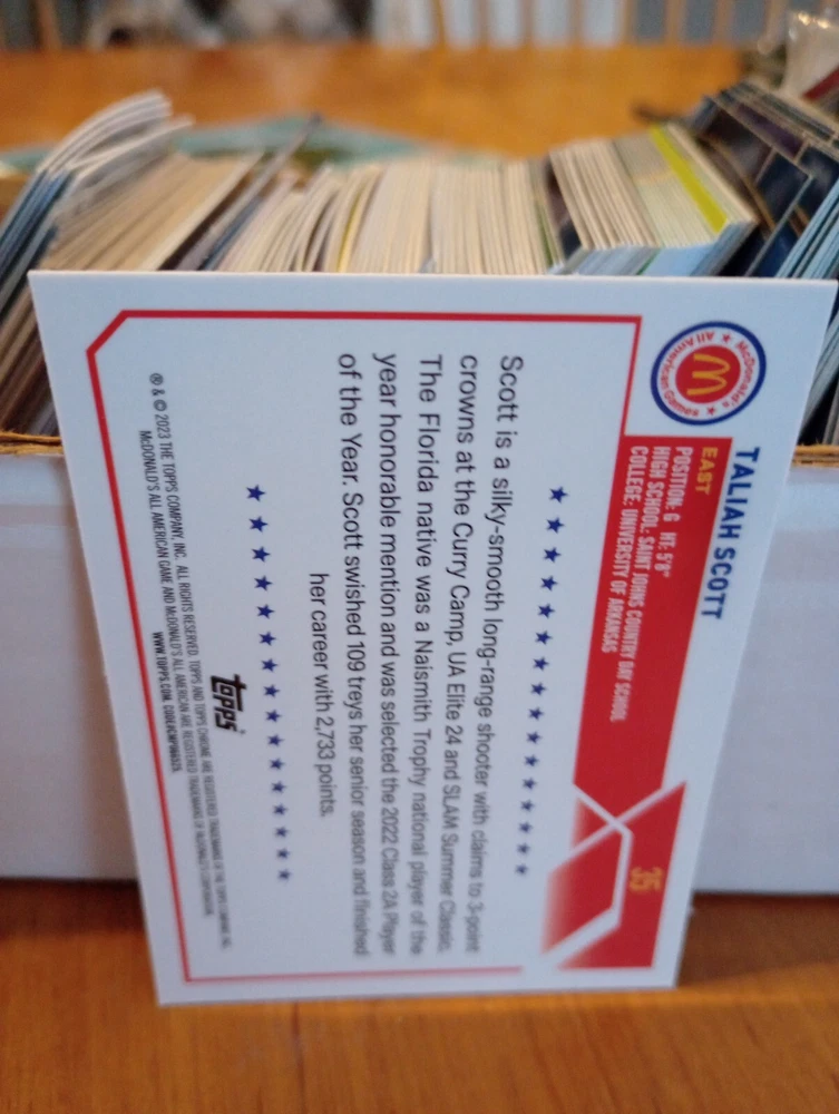 Capture a piece of basketball history with the 2023 Topps Chrome McDonald's #35 card featuring Taliah Scott of the Arkansas Razorbacks. This collectible card is a must-have for fans and collectors alike, showcasing the athleticism and talent of this promising player. Part of the esteemed 2023 Topps Chrome Base Set, it is a staple of sports memorabilia. The card, numbered 35, highlights Scott in her college uniform, ready to hit the court. As a part of the NCAA's league, this card captures the spirit of college basketball. Manufactured by Topps, known for their quality sports trading cards, this item is a standout with its sleek Chrome parallel/variety finish.