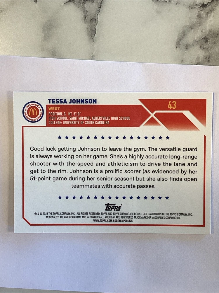 This 2023 Topps Chrome McDonald's All American trading card features Tessa Johnson, a rising star in the basketball world. The card is part of the base set and rookie collection, and is numbered 43. It is a chrome variety and is in near mint/mint condition. The card is an original and was manufactured by Topps Co. in 2023. It features Tessa Johnson who played in both the National Basketball Association (NBA) and the National Collegiate Athletic Association (NCAA). This trading card is perfect for any basketball fan or collector.