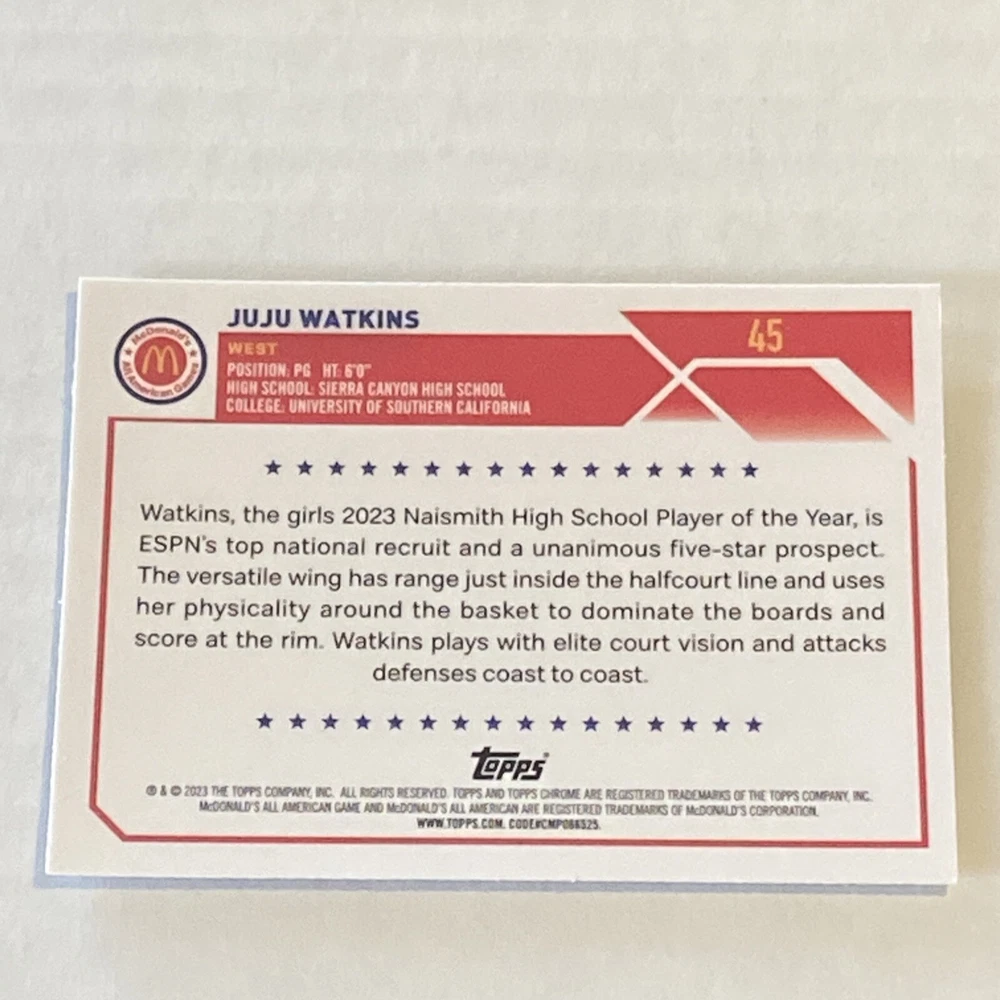 The product is a 2023 Topps Chrome McDonald's All American trading card featuring JuJu Watkins of the USC Trojans. This Rookie card is part of the base set and is in near mint or better condition. It is ungraded and not autographed. The card number is 45 and it was manufactured in 2023. It is a basketball sports trading card produced by Topps.