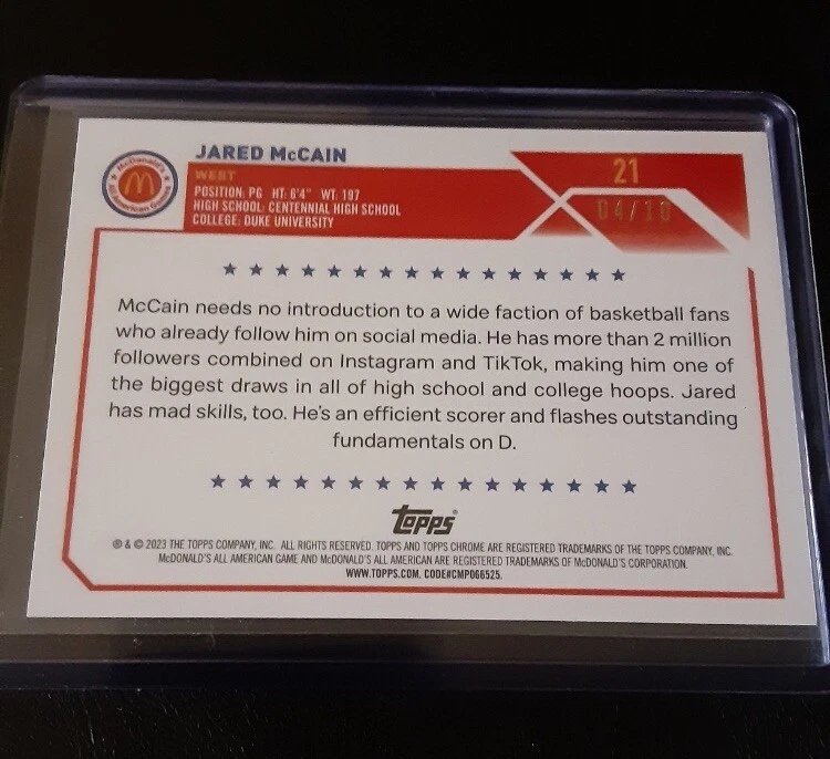 This 2023 Topps Chrome McDonald's All American sports trading card features Jared McCain, a basketball player and rookie. The card is a black refractor parallel/variety, with a print run of only 10, making it a rare find for collectors. It is also serial numbered and part of the base set, adding to its value and collectibility. The card is manufactured by Topps and is one of the 2023 season's most sought-after trading cards. It is perfect for fans of basketball and sports trading cards alike. Don't miss out on the opportunity to add this unique and valuable card to your collection.