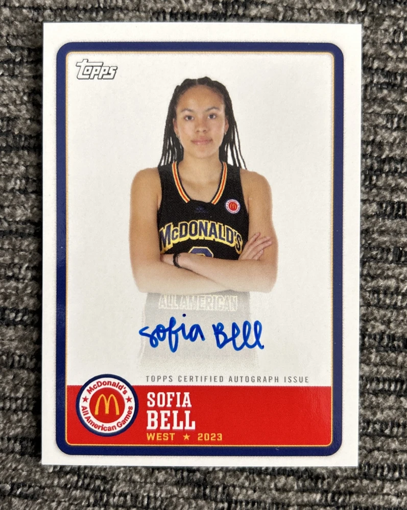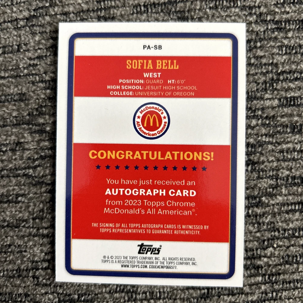 Player/Athlete: Sofia Bell Series: Topps Chrome McDonald's All American Features: Rookie, Insert Set: 2023 Topps Chrome McDonald's All American Insert Set: Paper Autographs Season: 2023 Sport: Basketball Parallel/Variety: [Base] Manufacturer: Topps Card Number: PA-SB brand: Topps Autographed: Yes