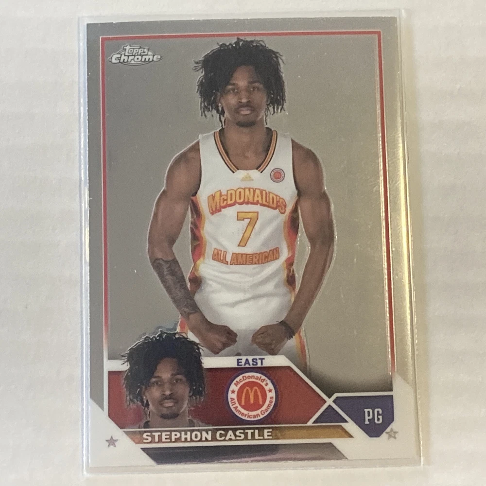 The 2023 Topps Chrome McDonald's All American trading card features Stephon Castle, a player for the UConn Huskies basketball team. This rookie card is a Refractor parallel in near mint condition or better. It is part of the base set, with card number 52, and includes the NCAA and features autograph unknown.